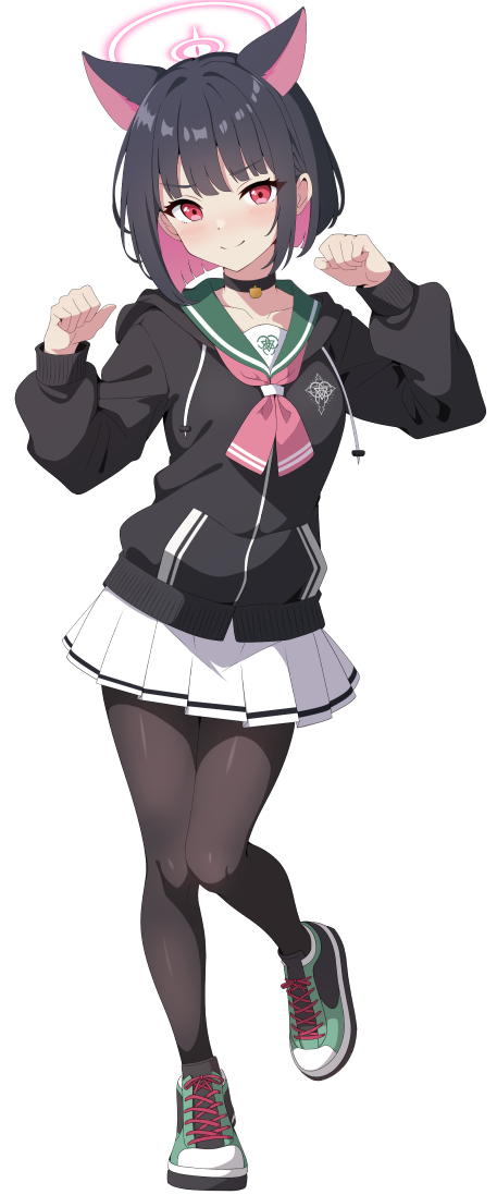 1girl animal_ears black_choker black_hair black_jacket black_pantyhose blue_archive blush cat_ears choker closed_mouth commentary_request extra_ears full_body green_sailor_collar green_shoes hood hood_down hooded_jacket jacket kazusa_(blue_archive) long_sleeves looking_at_viewer pantyhose partial_commentary pleated_skirt red_eyes sailor_collar shiguren_39 shoes short_hair simple_background skirt smile solo white_background white_skirt