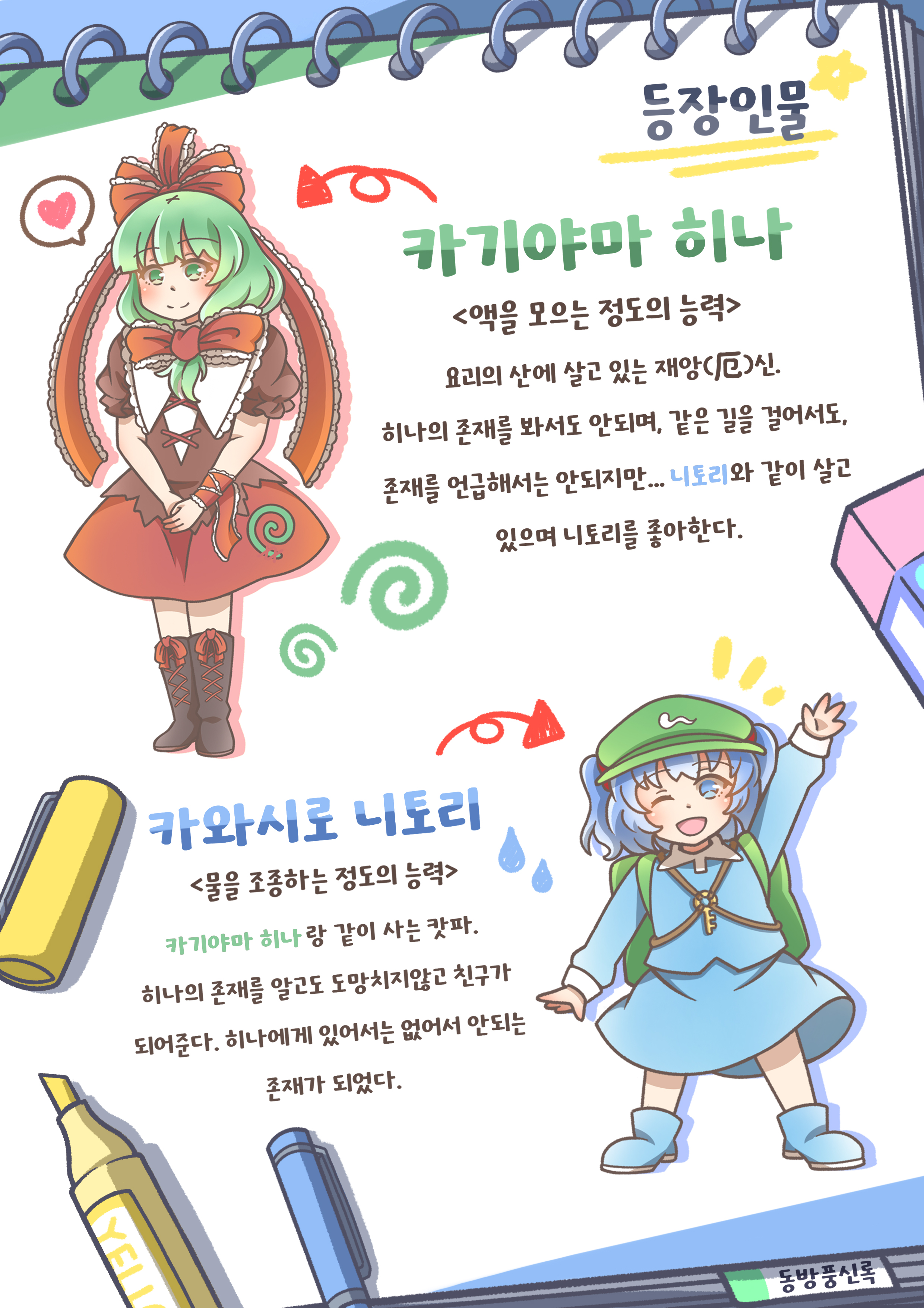 2girls ;d absurdres arm_up arrow_(symbol) black_footwear blue_eyes blue_footwear blue_hair blue_shirt blue_skirt boots commentary_request eraser flat_cap frilled_ribbon frills full_body green_hair green_headwear hair_bobbles hair_ornament hair_ribbon hat hayo_(qudtjr4682) heart highres kagiyama_hina kawashiro_nitori key korean_commentary korean_text medium_hair multiple_girls one_eye_closed open_mouth red_ribbon red_skirt ribbon rubber_boots shirt short_sleeves simple_background skirt smile spoken_heart touhou translation_request two_side_up v_arms white_background
