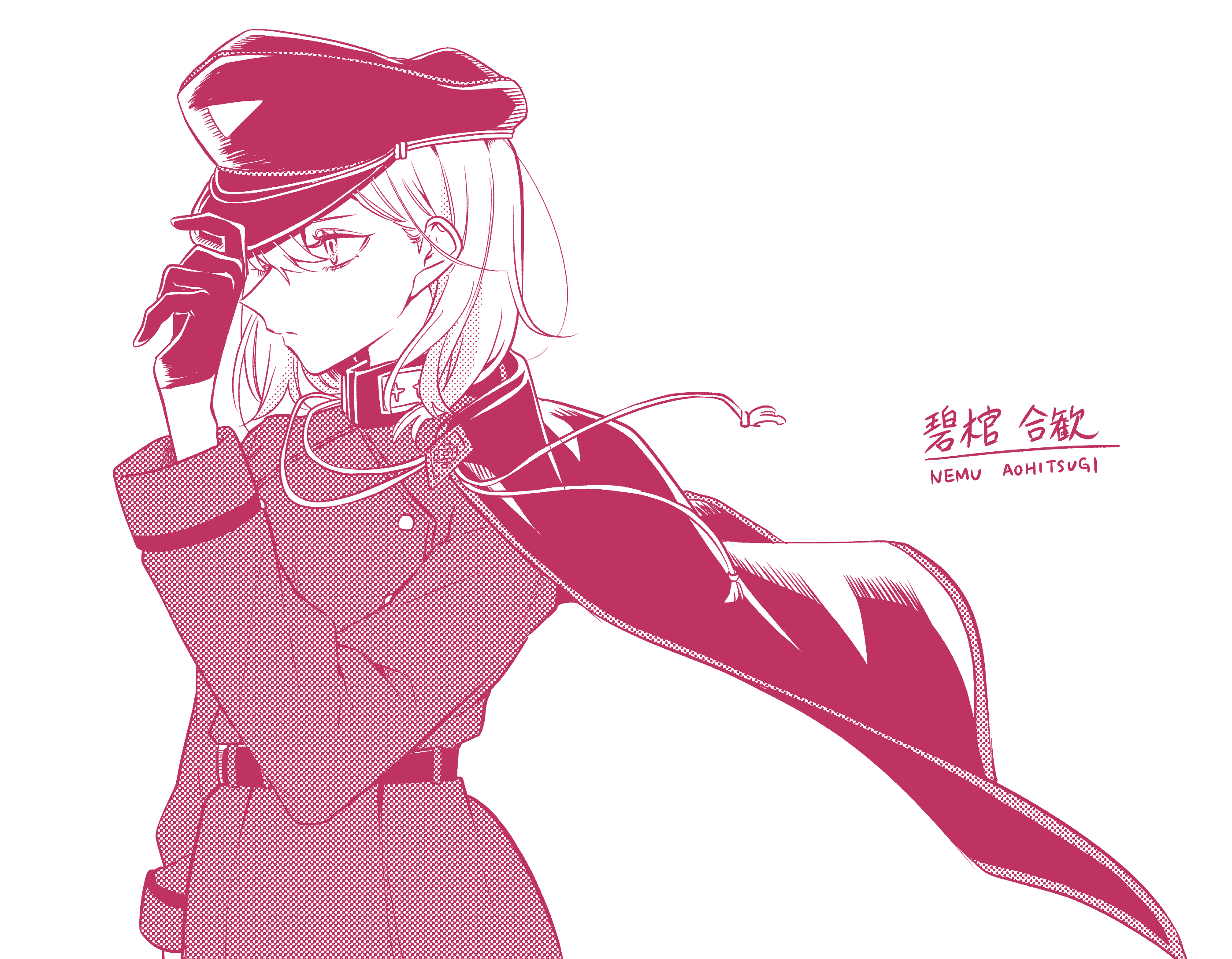1girl adjusting_clothes adjusting_headwear aohitsugi_nemu belt cape character_name closed_mouth cowboy_shot gloves hair_between_eyes hat highres hypnosis_mic kashikaze long_sleeves military_hat military_uniform monochrome peaked_cap screentones short_hair simple_background solo