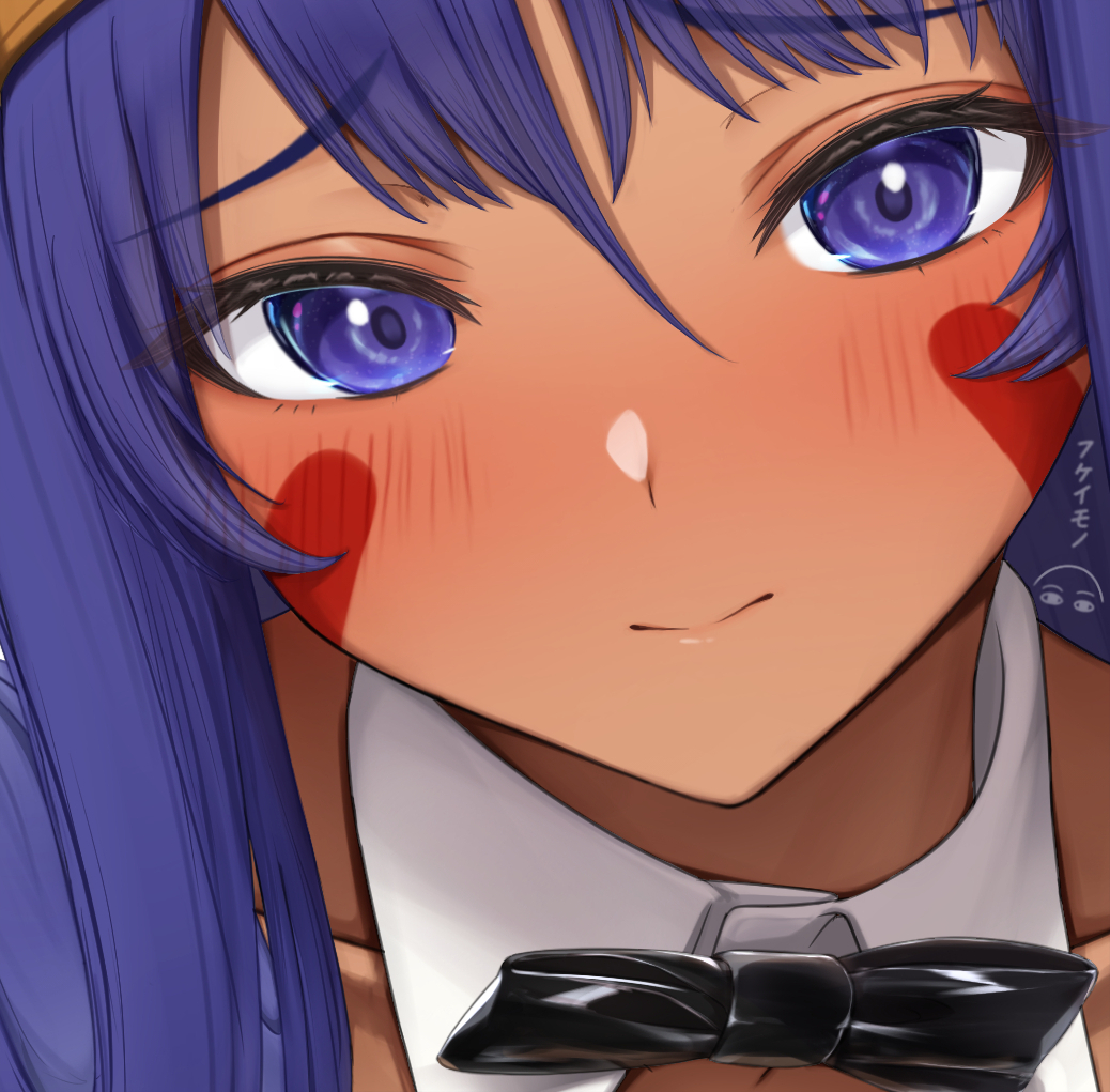 1girl blush bow bowtie closed_mouth dark-skinned_female dark_skin detached_collar facepaint facial_mark fate/grand_order fate_(series) hairband long_hair looking_at_viewer nitocris_(fate) particle_sfs portrait purple_eyes purple_hair sidelocks solo