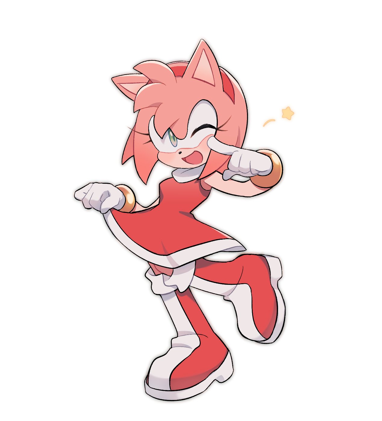1girl amy_rose animal_ears animal_nose boots bracelet commentary dress full_body furry furry_female gloves green_eyes hairband highres jewelry looking_at_viewer mo0n_friend one_eye_closed open_mouth red_boots red_dress red_hairband simple_background smile solo sonic_(series) star_(symbol) untranslatable_commentary white_background white_gloves