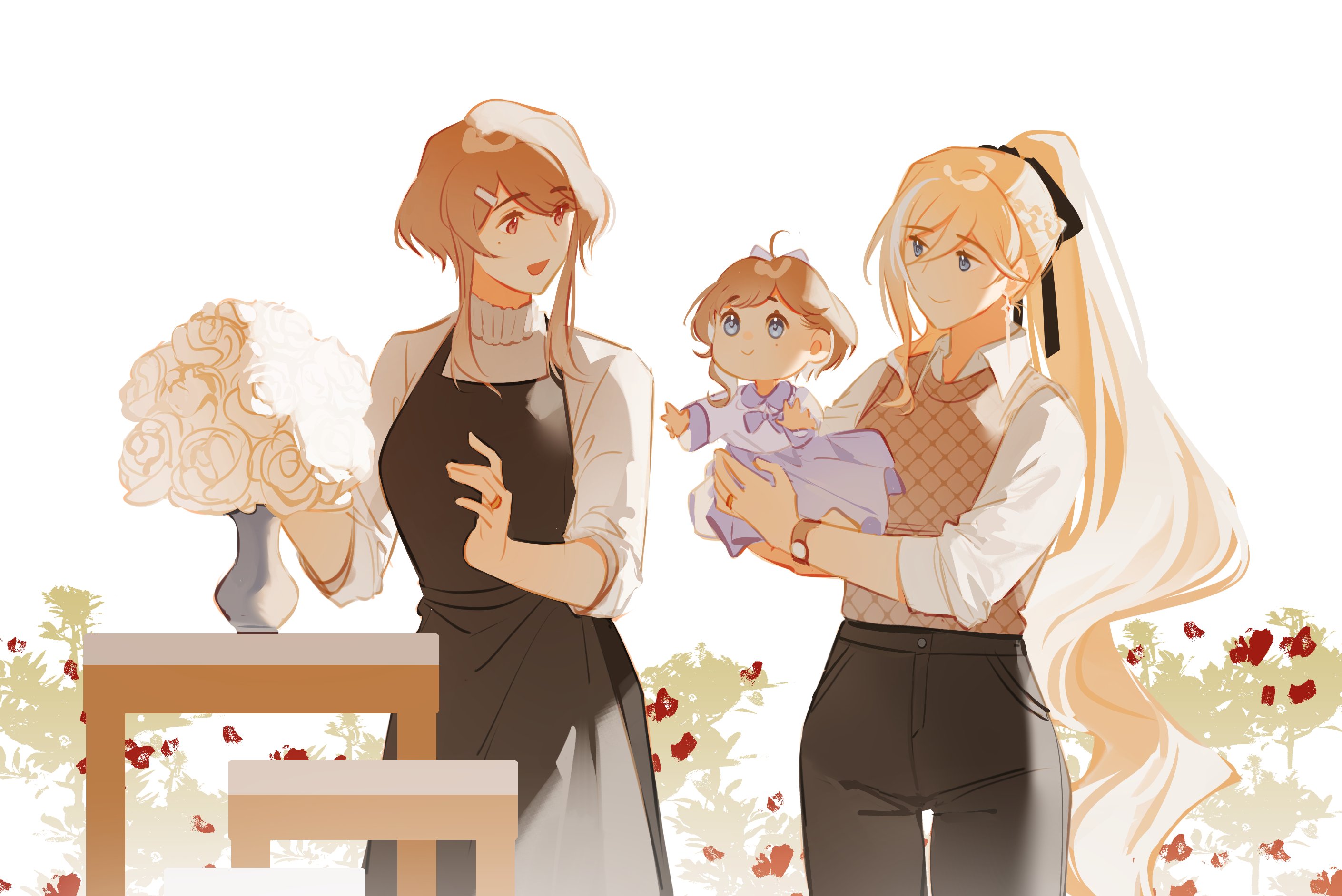 3girls apron black_apron blonde_hair blue_eyes collared_shirt durandal_(honkai_impact) hair_over_one_eye highres honkai_(series) honkai_impact_3rd if_they_mated long_hair mother_and_child mother_and_daughter multiple_girls parent_and_child rita_rossweisse shirt sweater wife_and_wife ylceon yuri