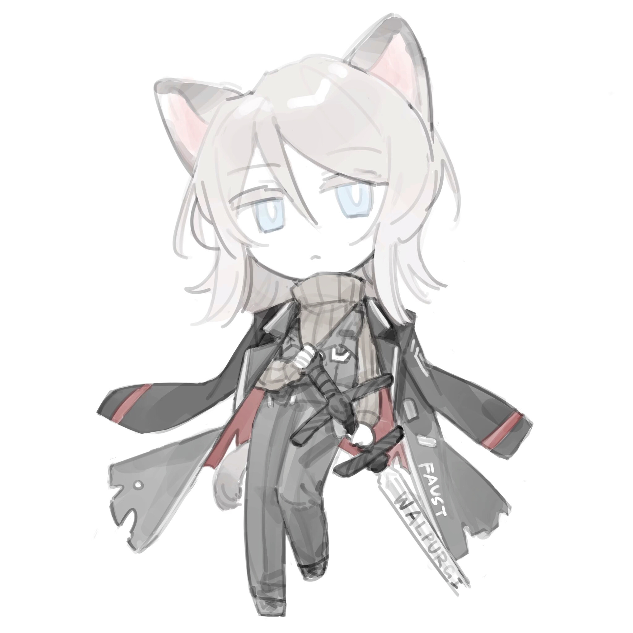 1girl animal_ears black_coat black_pants black_shoes black_vest blue_eyes brown_sweater cat_ears cat_tail chibi closed_mouth coat coat_on_shoulders faust_(project_moon) highres holding holding_sword holding_weapon ivy_(675671) limbus_company pants project_moon ribbed_sweater shirt shoes short_hair simple_background solo sweater sword tail vest weapon white_hair white_shirt zweihander