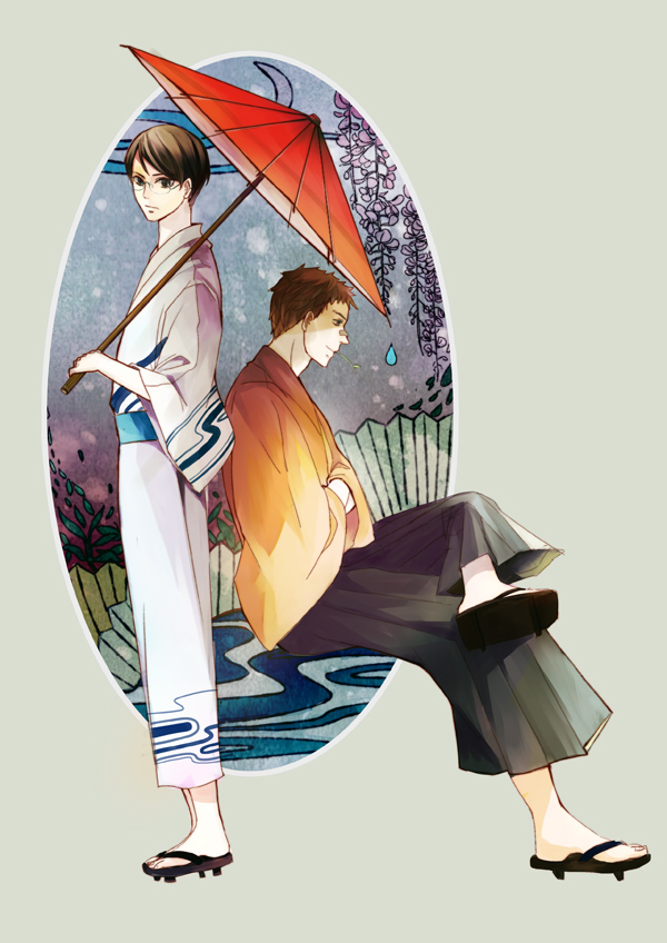 2boys bandaid bandaid_on_face bandaid_on_nose black_eyes black_hair black_hakama brown_eyes brown_hair crossed_arms crossed_legs facial_scar flower from_side full_body geta glasses hakama hakama_pants hand_under_clothes holding holding_umbrella invisible_chair japanese_clothes kalalaka kawabuchi_sentarou kimono looking_at_viewer male_focus multiple_boys nishimi_kaoru oil-paper_umbrella orange_kimono pants sakamichi_no_apollon sash scar scar_on_cheek scar_on_face short_hair sitting smile umbrella wavy_hair white_kimono wisteria yukata