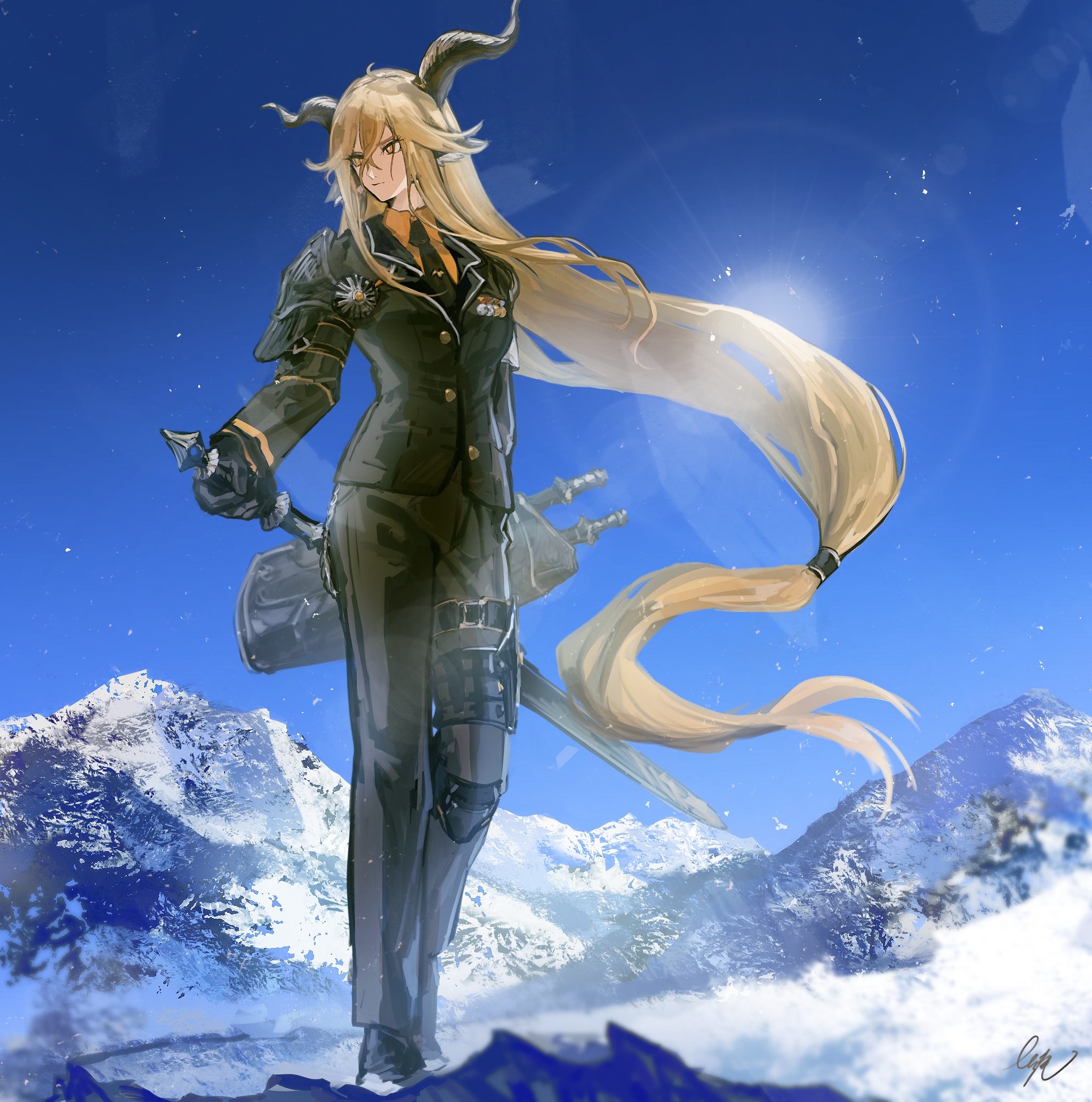 1girl animal_ears arknights black_necktie blonde_hair blue_sky breasts collared_shirt commentary degenbrecher_(arknights) frown full_body goat_ears goat_girl goat_horns green_jacket green_pants highres holding holding_sword holding_weapon horns jacket lens_flare long_hair looking_to_the_side low-tied_long_hair medal medium_breasts military_uniform mountain nanataru10 necktie orange_shirt outdoors pants sheath shirt sidelocks sky solo sword thigh_strap weapon yellow_eyes