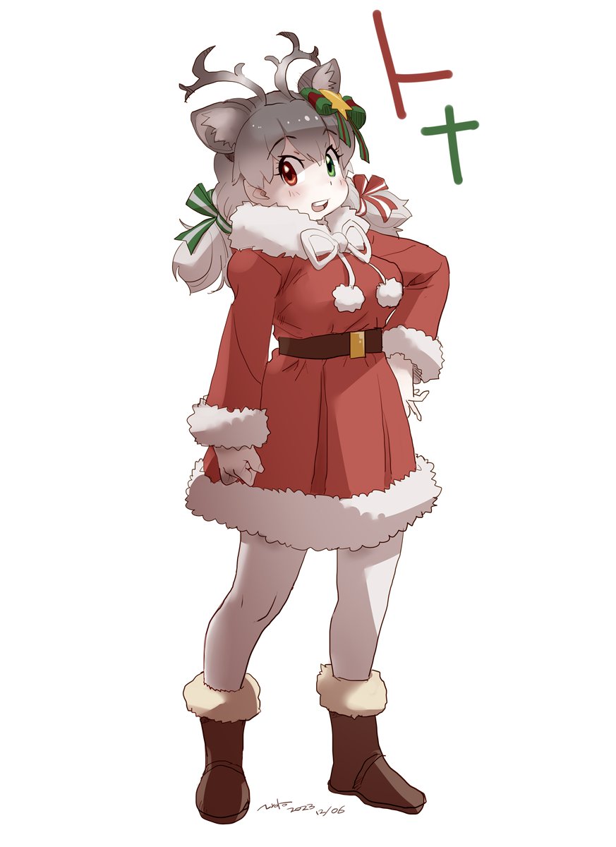 1girl animal_ears antlers belt boots bow brown_belt brown_boots brown_hair deer_ears deer_girl dress extra_ears full_body fur_collar fur_trim green_bow green_eyes hair_bow heterochromia highres horns kemono_friends long_hair looking_at_viewer multicolored_hair nyororiso_(muyaa) open_mouth pantyhose red_bow red_dress red_eyes reindeer_(kemono_friends) reindeer_antlers reindeer_girl santa_costume smile solo twintails white_bow white_fur white_hair white_pantyhose