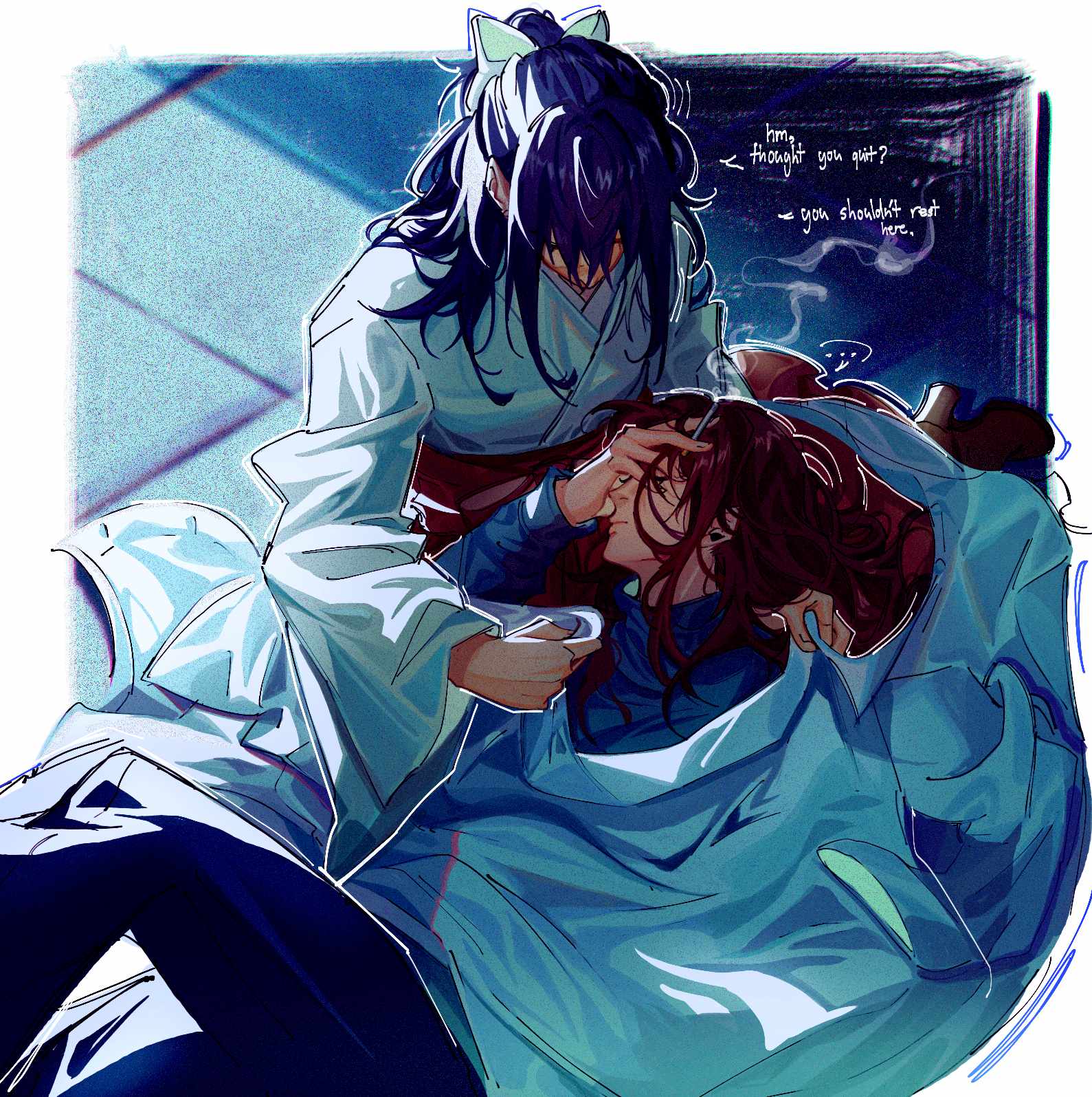 ... 2girls black_pants blanket blue_sweater bow brown_hair cigarette closed_mouth commentary english_commentary english_text hair_bow high_heels highres ieiri_shoko imnotxreitive iori_utahime japanese_clothes jujutsu_kaisen kimono lap_pillow long_hair long_sleeves multiple_girls night on_ground pants purple_hair smoke smoking sweater turtleneck turtleneck_sweater white_kimono yuri