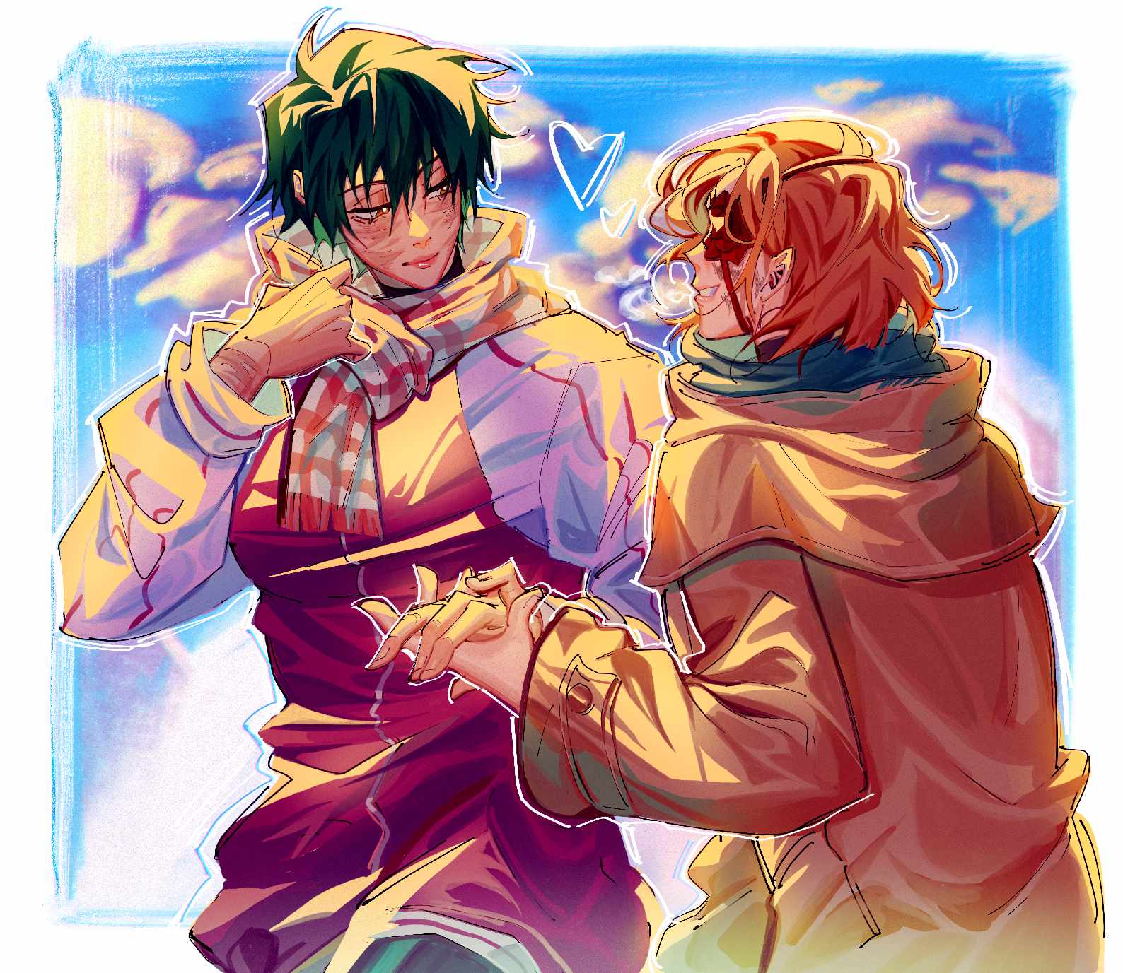 2girls blue_scarf blue_sky brown_coat brown_eyes checkered_clothes checkered_scarf cloud coat commentary day english_commentary eyepatch green_hair heart highres holding_hands imnotxreitive jacket jujutsu_kaisen kugisaki_nobara long_sleeves multiple_girls orange_hair outdoors pink_sleeves red_jacket red_scarf scar scar_on_arm scar_on_face scarf short_hair sky white_scarf winter_clothes yuri zen'in_maki zen'in_maki_(post_shibuya)
