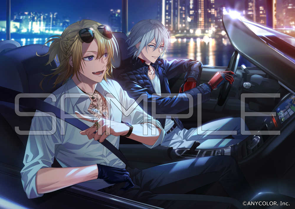 2boys :d arm_tattoo belt belt_buckle black_belt black_gloves black_jacket black_pants blonde_hair buckle car chest_tattoo city collared_shirt convertible copyright_notice driving eyewear_on_head facial_tattoo fang feet_out_of_frame finger_tattoo fulgur_ovid gloves grey_eyes grey_hair hair_between_eyes hair_ornament hairclip half_updo jacket jewelry leather leather_jacket long_sleeves luca_kaneshiro male_focus mechanical_arms medium_hair motor_vehicle multiple_boys night nijisanji nijisanji_en official_art open_clothes open_collar open_jacket open_mouth pants parted_lips pendant_choker pointing ponytail purple_eyes ring sample_watermark shirt short_hair short_ponytail siiisuuu single_glove smile sunglasses t-shirt tattoo virtual_youtuber watch water watermark white_pants wristwatch