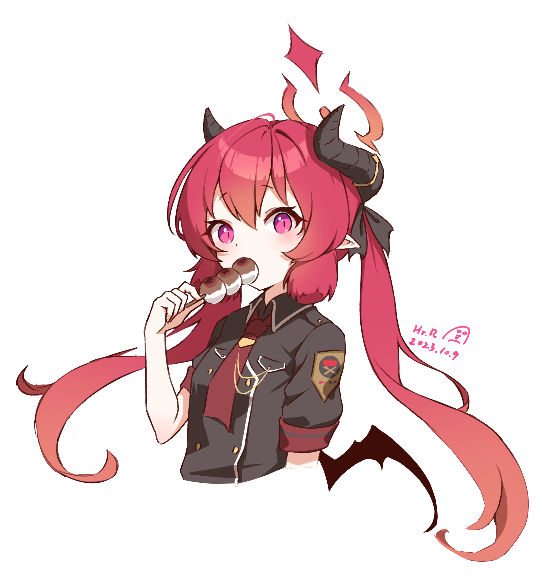 1girl artist_logo artist_name black_jacket blue_archive blunt_tresses breasts buttons collared_shirt cropped_torso dated dot_nose double-breasted eating food halo highres horns hr.r jacket junko_(blue_archive) logo long_hair looking_at_viewer mochi necktie pink_eyes pointy_ears red_necktie shirt short_sleeves simple_background skewer slit_pupils small_breasts solo upper_body white_background wings