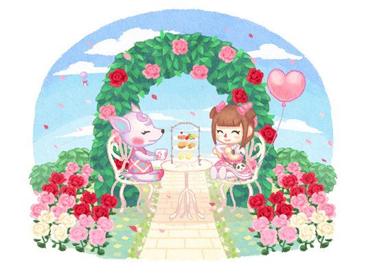2girls ^_^ animal_bag animal_crossing arch bag balloon blue_sky blunt_bangs blush box brown_hair bush cake cake_slice chair closed_eyes closed_mouth cloud commentary_request cookie cup day deer_girl diana_(animal_crossing) double_bun dress falling_petals flower food furry furry_female gift gift_box grass hair_bun hair_ornament hands_up heart_balloon holding holding_cup moai_(aoh) multiple_girls nintendo on_chair outdoors petals pink_dress pink_flower pink_rose pink_skirt puffy_short_sleeves puffy_sleeves red_flower red_rose rose shirt shoes short_hair short_sleeves sidelocks sitting skirt sky sleeveless sleeveless_dress smile stone_walkway table teacup tiered_tray villager_(animal_crossing) white_flower white_footwear white_rose white_shirt