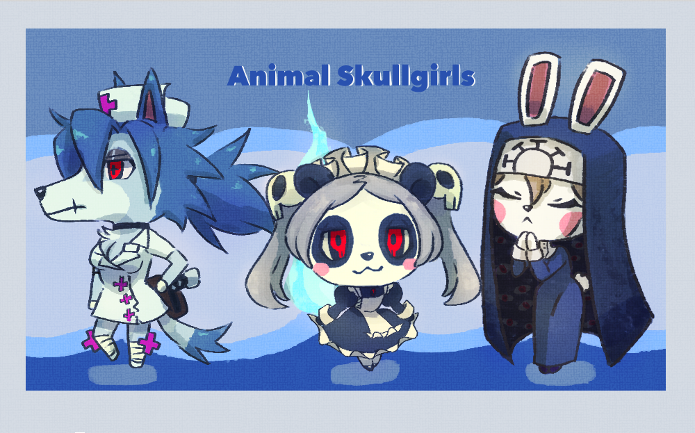 3girls animal_crossing apron blonde_hair bloody_marie_(skullgirls) blue_background blue_hair blush_stickers breasts chibi choker cleavage copyright_name crossover double_(skullgirls) dress fire frilled_apron frilled_dress frills grey_hair hair_ornament hand_on_own_hip hat kyouhei_hei maid_headdress medium_breasts multiple_girls nintendo nun nurse_cap panda pouch rabbit red_eyes scar skull_hair_ornament skullgirls smile twintails valentine_(skullgirls) wolf