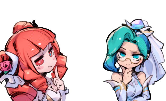 2girls bare_shoulders blunt_bangs blush character_request check_character crystal_rose_vayne detached_sleeves double_bun drill_hair glasses green_eyes green_hair gwen_(league_of_legends) hair_bun hand_up index_finger_raised league_of_legends league_of_legends:_wild_rift long_hair multicolored_hair multiple_girls phantom_cross prestige_crystal_rose_gwen red_eyes red_hair short_hair simple_background smile two-tone_hair vayne_(league_of_legends) wavy_mouth white_background