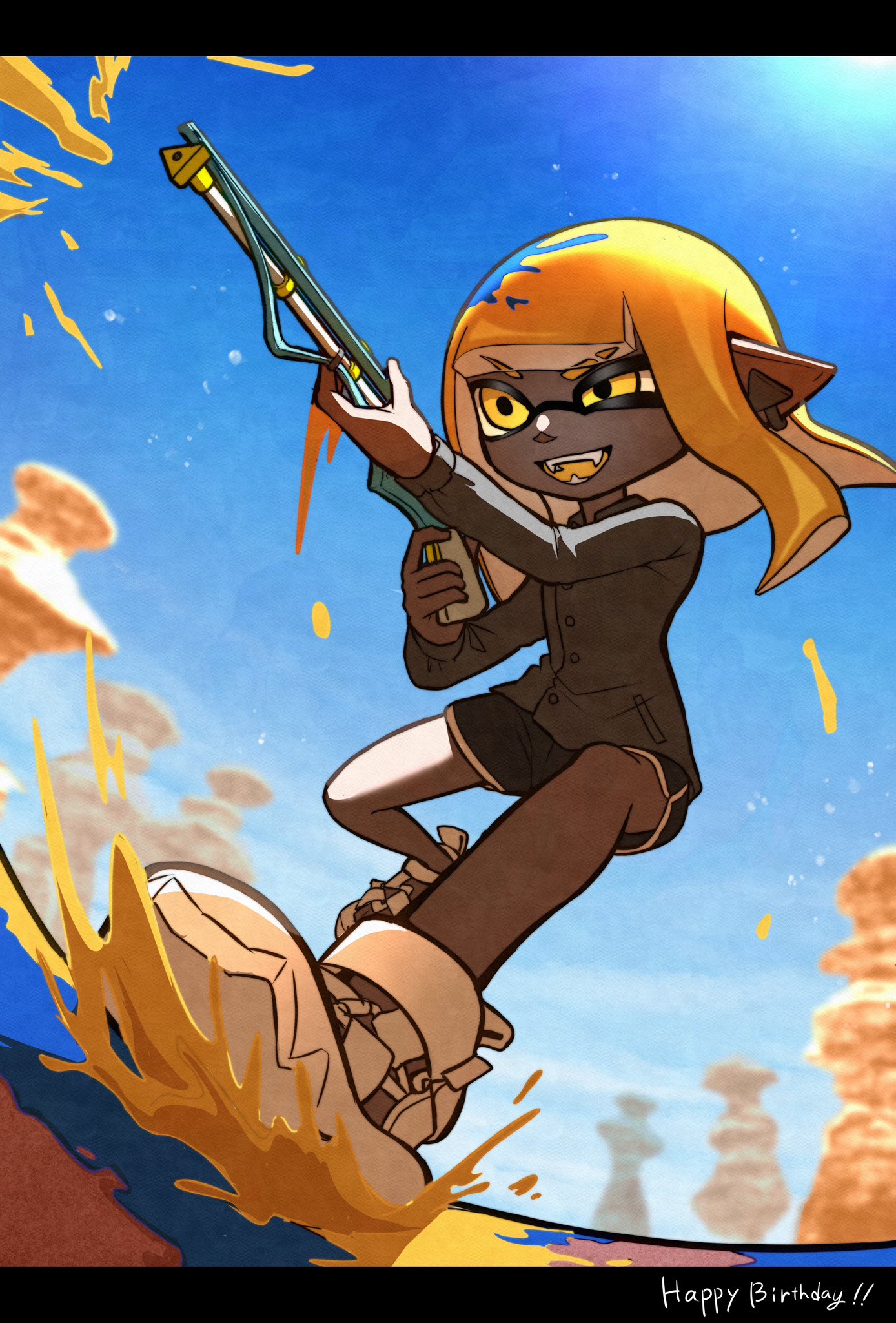 1girl bike_shorts blonde_hair blue_sky commentary_request eyebrow_cut full_body grey_shirt gun highres holding holding_gun holding_weapon inkling inkling_girl inkling_player_character medium_hair nintendo open_mouth paint pointy_ears shaded_face shadow shirt shoes sky solo splatoon_(series) splatoon_3 squiffer_(splatoon) sunlight teeth tkhrskrrmy v-shaped_eyebrows weapon white_shoes yellow_eyes