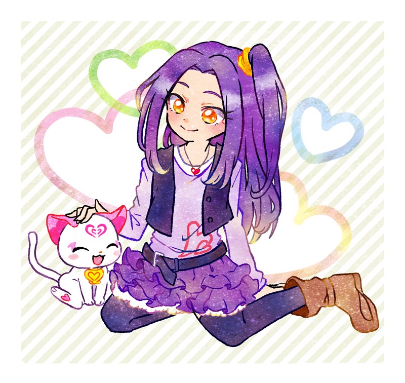 1girl blush boots cat closed_eyes commentary_request frills heart hoppetoonaka3 hummy_(precure) jewelry long_hair magical_girl open_mouth precure purple_hair seiren_(precure) side_ponytail skirt smile suite_precure thighhighs yellow_eyes