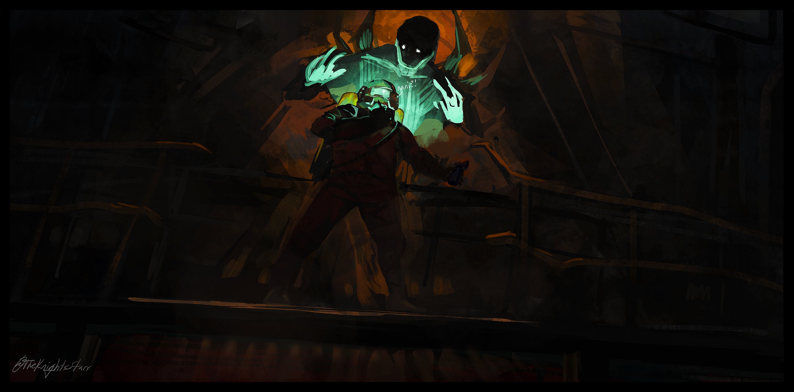 1other bodysuit bracken_(lethal_company) dark eyed_silhouette flashlight glowing glowing_eyes guard_rail hazmat_suit highres impending_doom indoors lethal_company monster orange_bodysuit oxygen_tank signature silhouette theknightsstars tube walkie-talkie worker_(lethal_company)