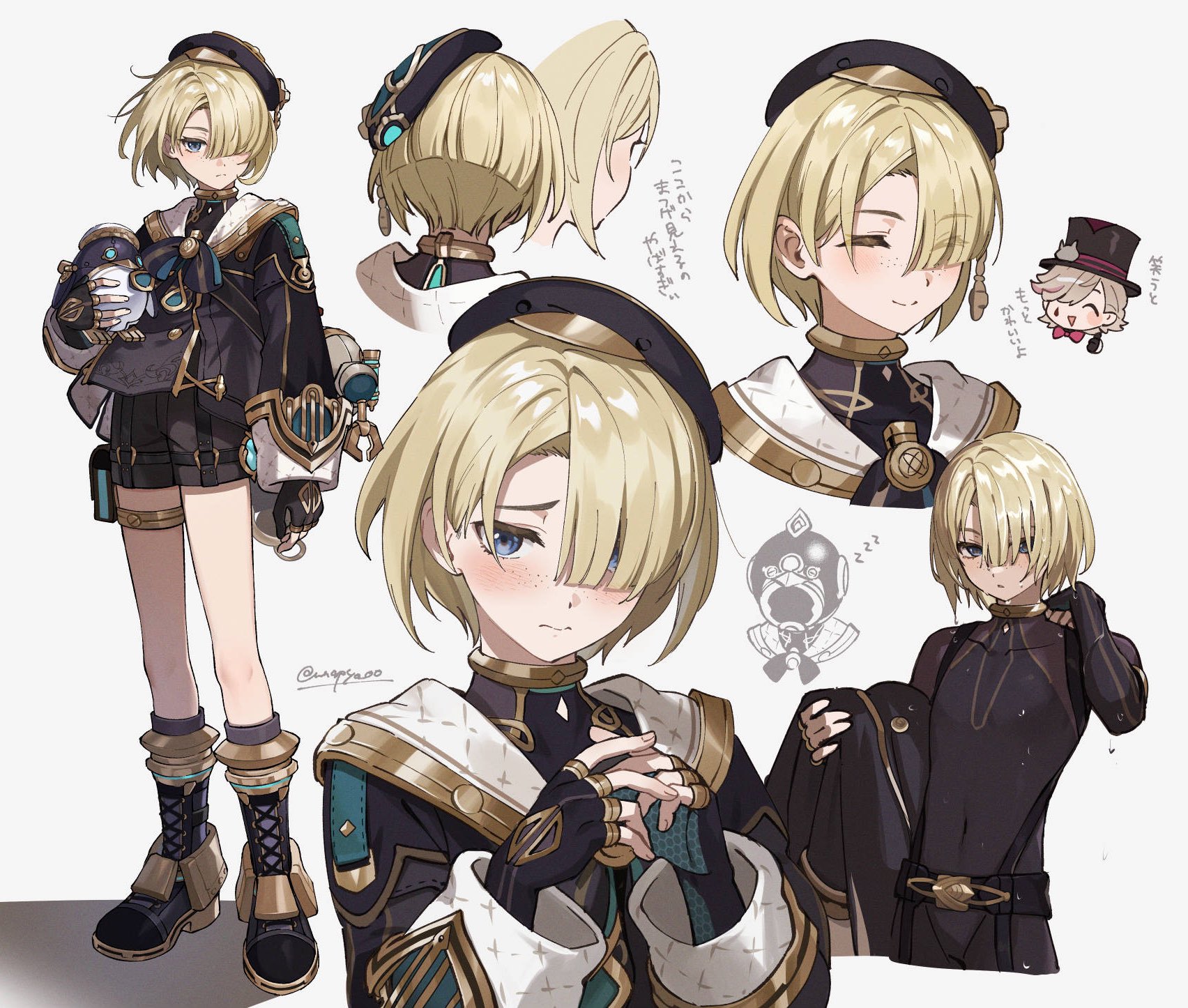 2boys androgynous animal beret black_footwear black_gloves black_headwear black_wetsuit blonde_hair blue_eyes blunt_bangs blunt_ends blush bodysuit boots chibi closed_eyes closed_mouth diving_suit facial_mark fingerless_gloves freckles freminet_(genshin_impact) from_behind full_body genshin_impact gloves gold_trim grey_hair hair_over_one_eye hat highres looking_at_viewer lyney_(genshin_impact) male_focus multiple_boys multiple_views non-humanoid_robot portrait robot robot_animal short_hair signature simple_background solo_focus standing stuffed_animal stuffed_penguin stuffed_toy teardrop_facial_mark top_hat translation_request twitter_username unapoppo upper_body wavy_mouth wet wetsuit white_background