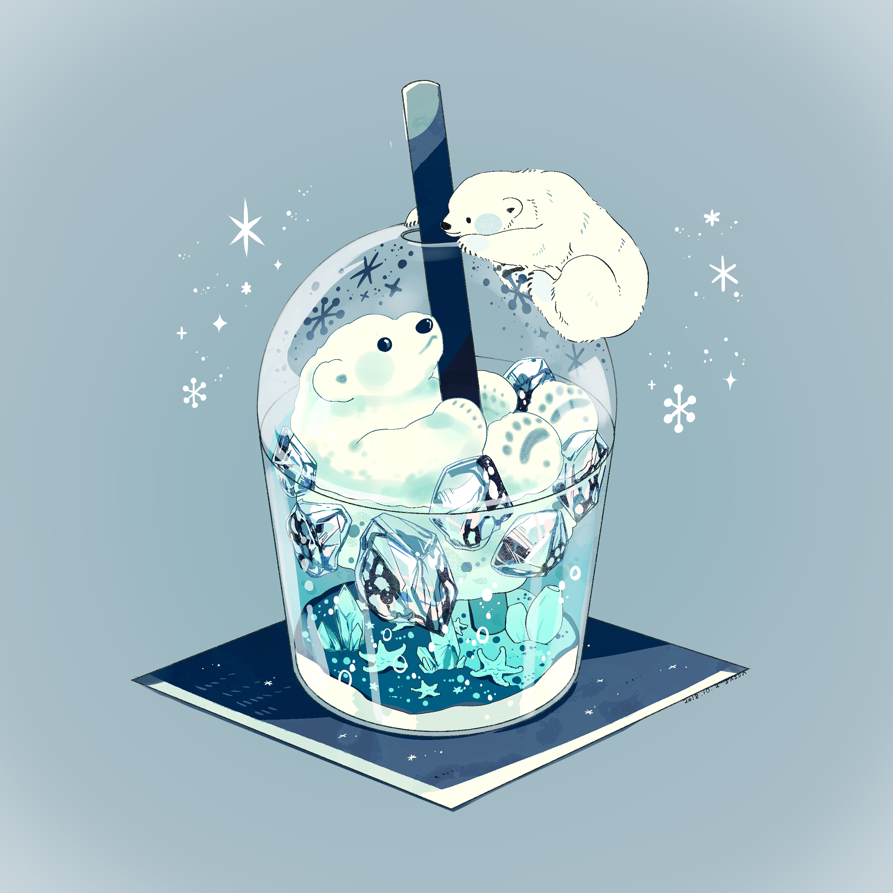 absurdres animal animal_focus bear black_eyes blue_background commentary_request cub cup disposable_cup drinking_straw highres ice ice_cube in_container in_cup looking_at_another napkin no_humans original oversized_object polar_bear sassa_(kyokuchi) simple_background snowflakes solid_circle_eyes