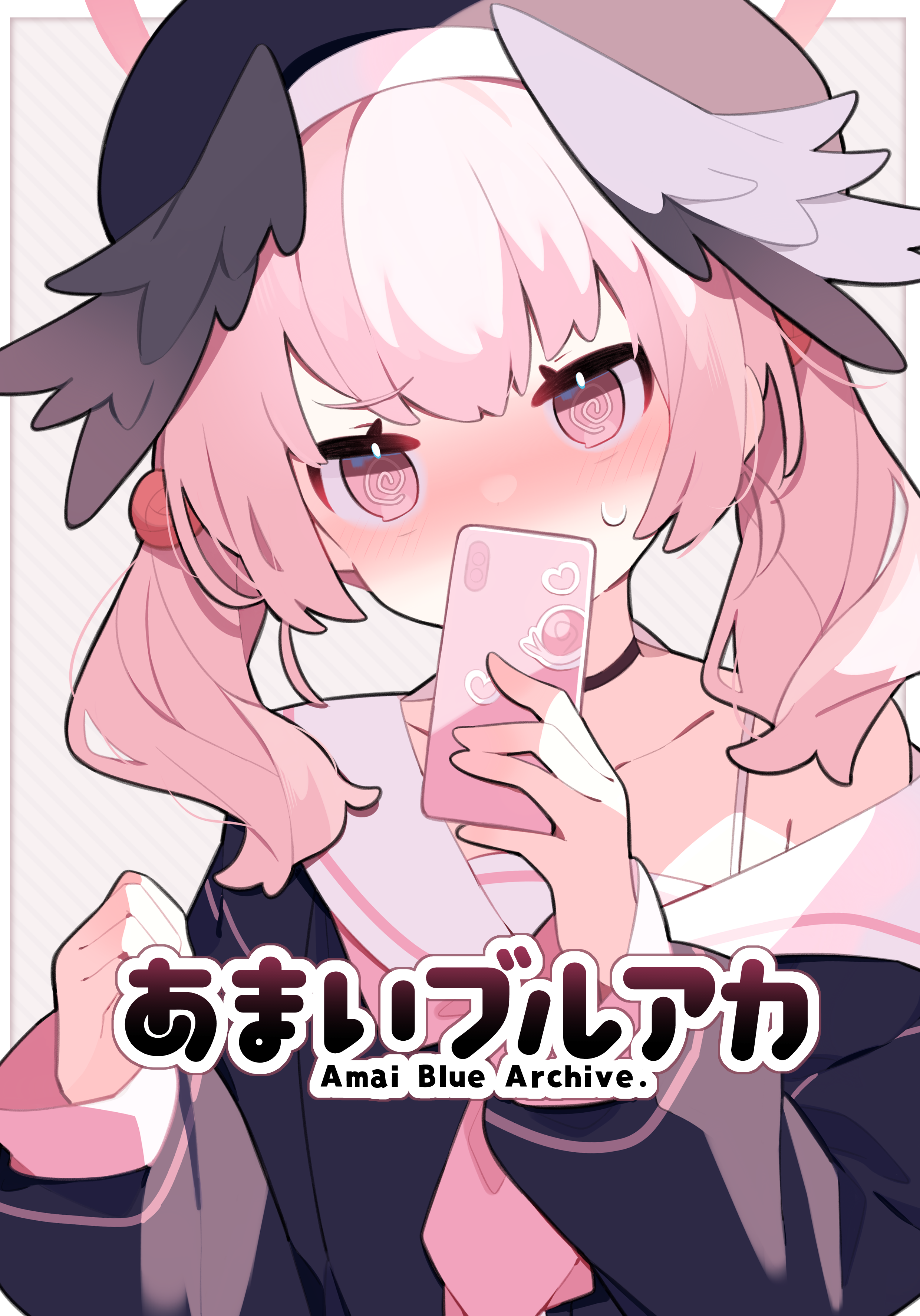 1girl @_@ absurdres beret black_hat black_shirt black_wings blue_archive blush cellphone collarbone halo hat head_wings highres holding holding_phone koharu_(blue_archive) long_hair long_sleeves neckerchief pekeko_(pepekekeko) phone pink_eyes pink_hair pink_halo pink_neckerchief sailor_collar sailor_shirt shirt simple_background smartphone solo twintails upper_body white_background white_sailor_collar wings