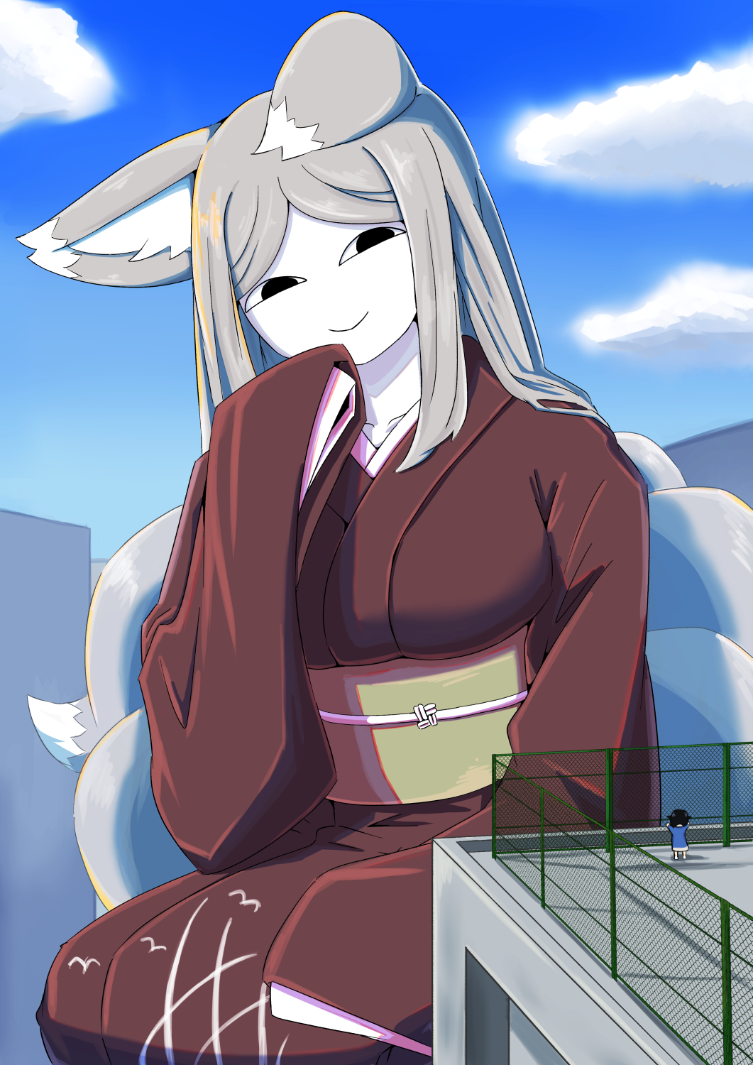 1girl 1other animal_ears borrowed_character cloud collarbone fox_ears fox_tail giant giantess highres japanese_clothes kimono long_hair long_sleeves looking_at_another mansion_fox_(yanaiba_(shishamohurai)) neko_040 original outdoors rooftop size_difference sleeves_past_wrists smile solo_focus tail