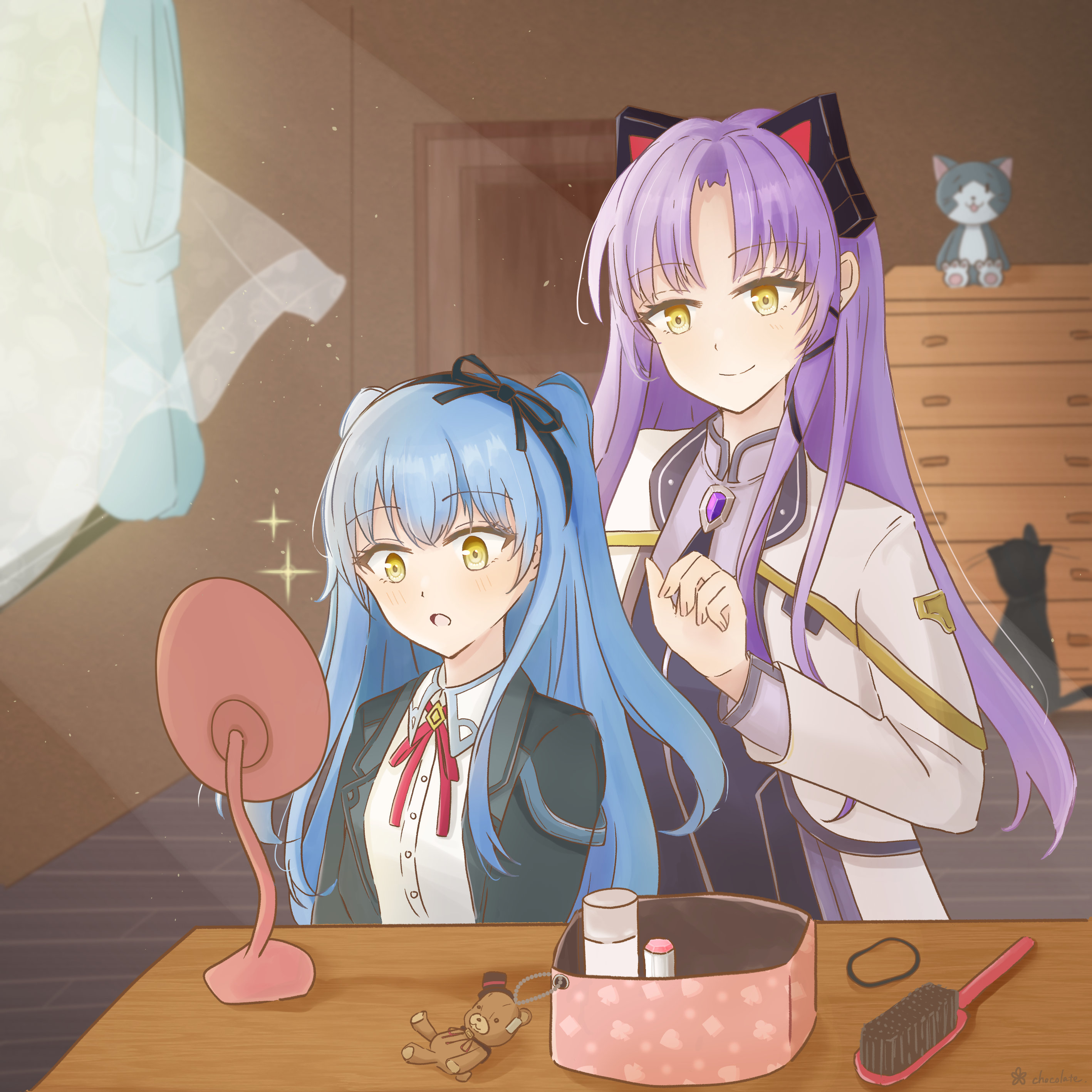 2girls :o absurdres alternate_hairstyle animal_ear_hairband animal_ears black_hairband blue_hair blurry blurry_background cabinet cat_ears commentary_request cosplay costume_switch curtained_hair dot_nose eiyuu_densetsu eyelashes fake_animal_ears formal_clothes hair_brush hairband hairstyle_switch hajimari_no_kiseki hanachocolate30 highres indoors kuro_no_kiseki kuro_no_kiseki_(series) kuro_no_kiseki_i kuro_no_kiseki_ii long_hair looking_at_mirror mirror mishy multiple_girls renne_(eiyuu_densetsu) sen_no_kiseki sen_no_kiseki_(series) sen_no_kiseki_i sen_no_kiseki_iv sitting smile sparkle standing stuffed_animal stuffed_toy suit teddy_bear tio_plato twintails upper_body white_suit window yellow_eyes