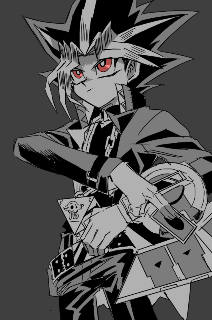 1boy duel_disk jacket male_focus medium_hair millennium_puzzle open_clothes open_jacket red_eyes shi_(shooo_ttt) simple_background sketch solo spot_color yami_yugi yu-gi-oh! yu-gi-oh!_duel_monsters