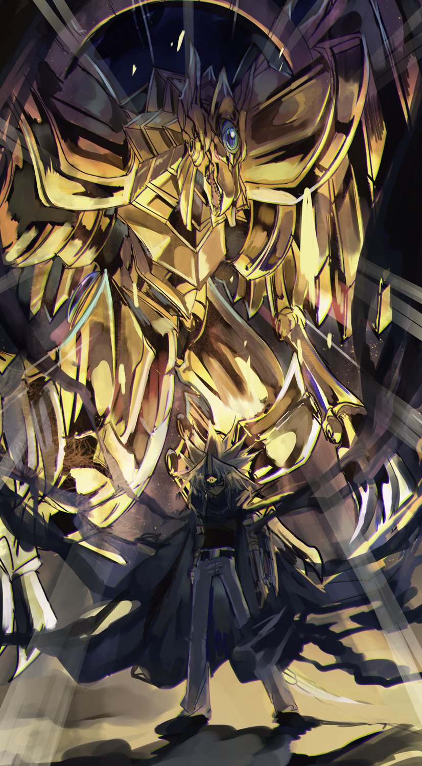 1boy cape dragon duel_monster highres long_hair male_focus red_eyes shi_(shooo_ttt) spiked_hair the_winged_dragon_of_ra yami_marik yu-gi-oh! yu-gi-oh!_duel_monsters