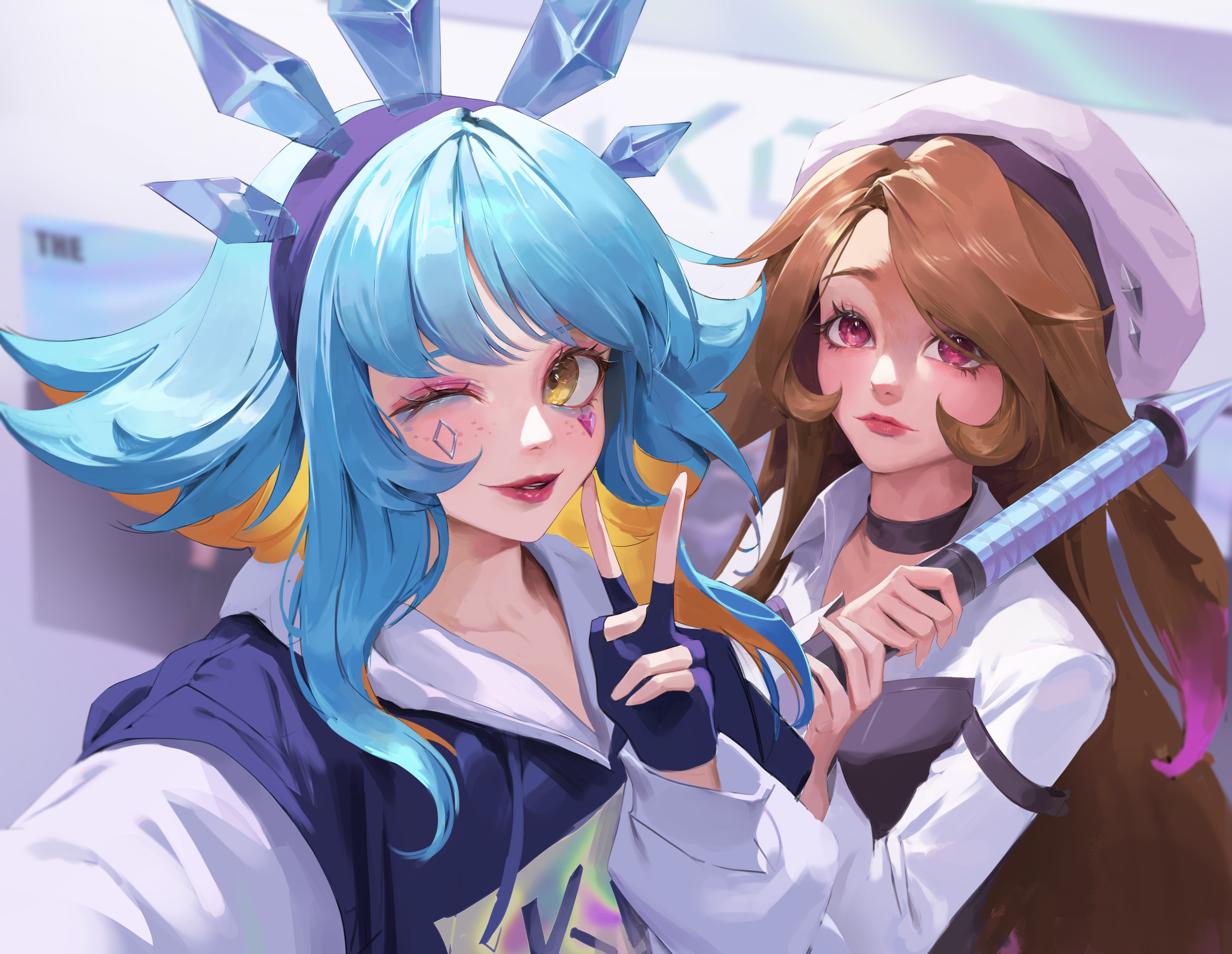 2girls absurdres beret black_gloves blue_hair brown_hair chameleon_girl closed_mouth fingerless_gloves gloves hair_between_eyes hat highres k/da_(league_of_legends) k/da_lillia k/da_neeko league_of_legends lillia_(league_of_legends) long_hair looking_at_viewer makeup multiple_girls neeko_(league_of_legends) official_alternate_costume official_alternate_hairstyle one_eye_closed pink_eyes sidelocks smile syami_(choiimi) teamfight_tactics upper_body v white_headwear yellow_eyes