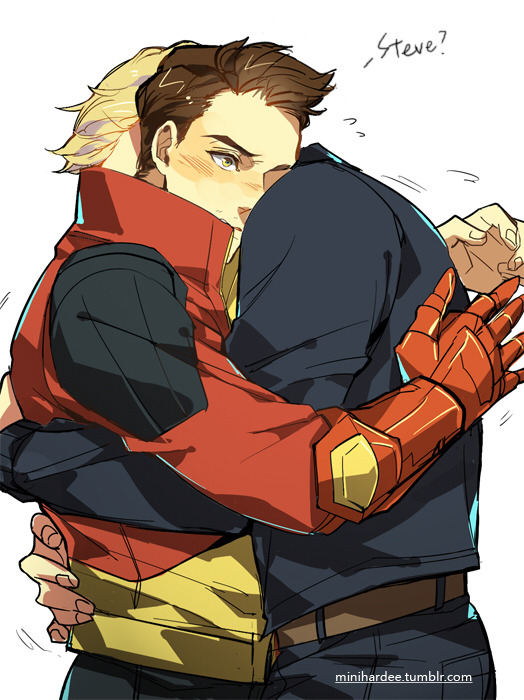 2boys animification armor avengers_(series) avengers_academy belt black_jacket black_pants blonde_hair blush brown_belt brown_hair english_text fingernails flying_sweatdrops hands_up hug jacket long_sleeves male_focus marvel minihardee multicolored_jacket multiple_boys pants power_armor red_armor red_jacket short_hair simple_background standing steve_rogers teeth tony_stark white_background yaoi yellow_eyes yellow_jacket