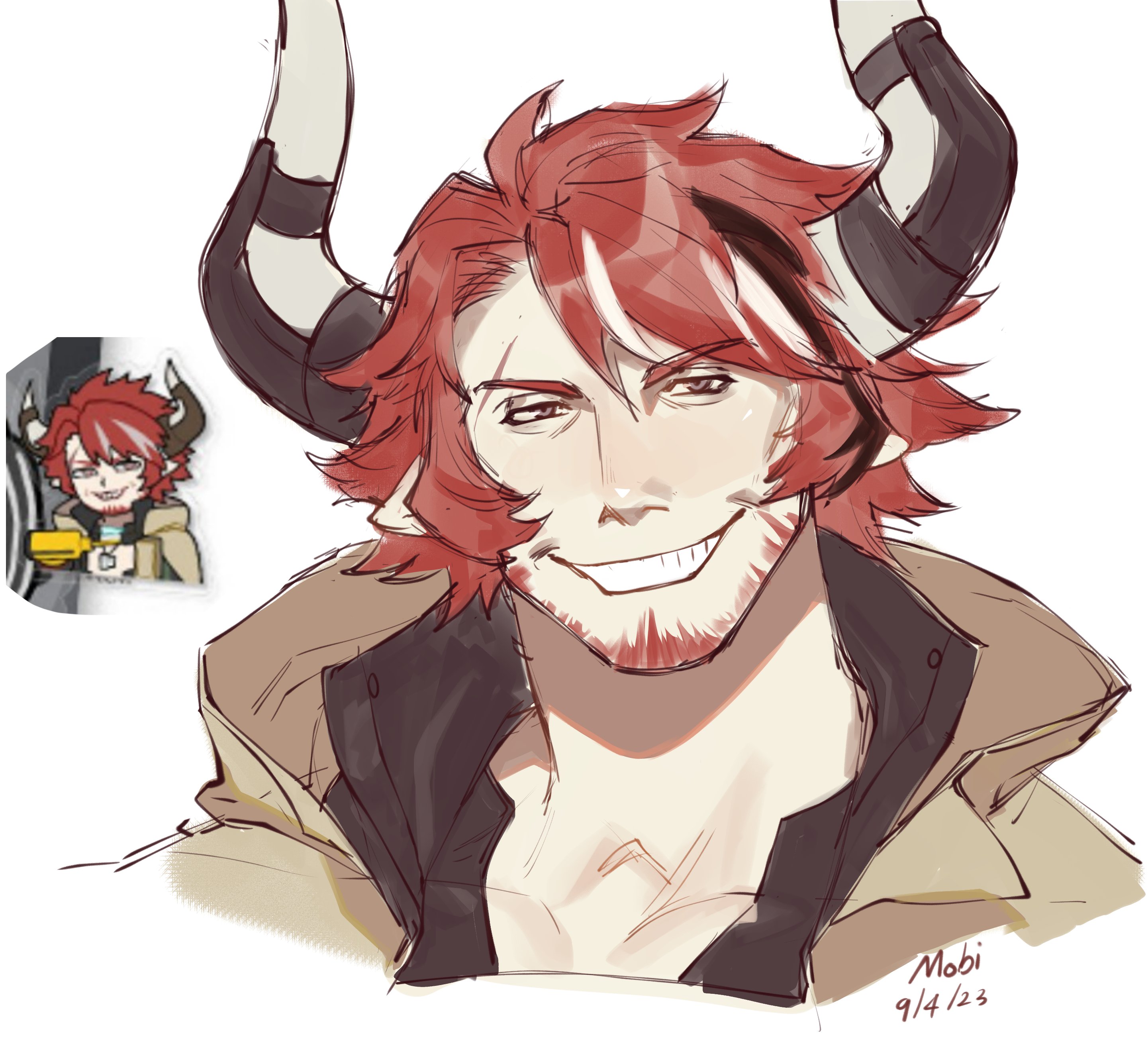 1boy absurdres animal_ears arknights beard cow_boy cow_ears cow_horns creepy_eyes cropped_torso facial_hair full_beard half-closed_eyes highres horns humus_(arknights) looking_at_viewer male_focus mature_male mobrinono multicolored_hair red_hair reference_inset short_hair smile streaked_hair thick_eyebrows