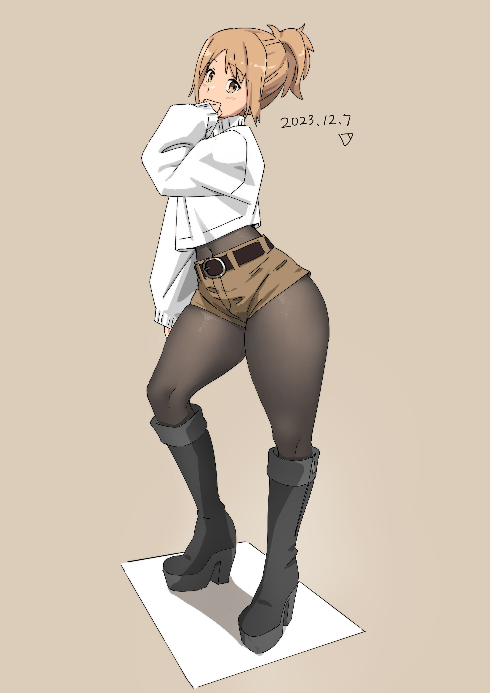 1girl alternate_costume alternate_hairstyle blonde_hair blush boots brown_eyes covered_navel dated full_body girls'_frontline high_heels highres knee_boots light_brown_background looking_at_viewer midriff mp40_(girls'_frontline) short_shorts shorts solo sweater triangle_bullet white_sweater
