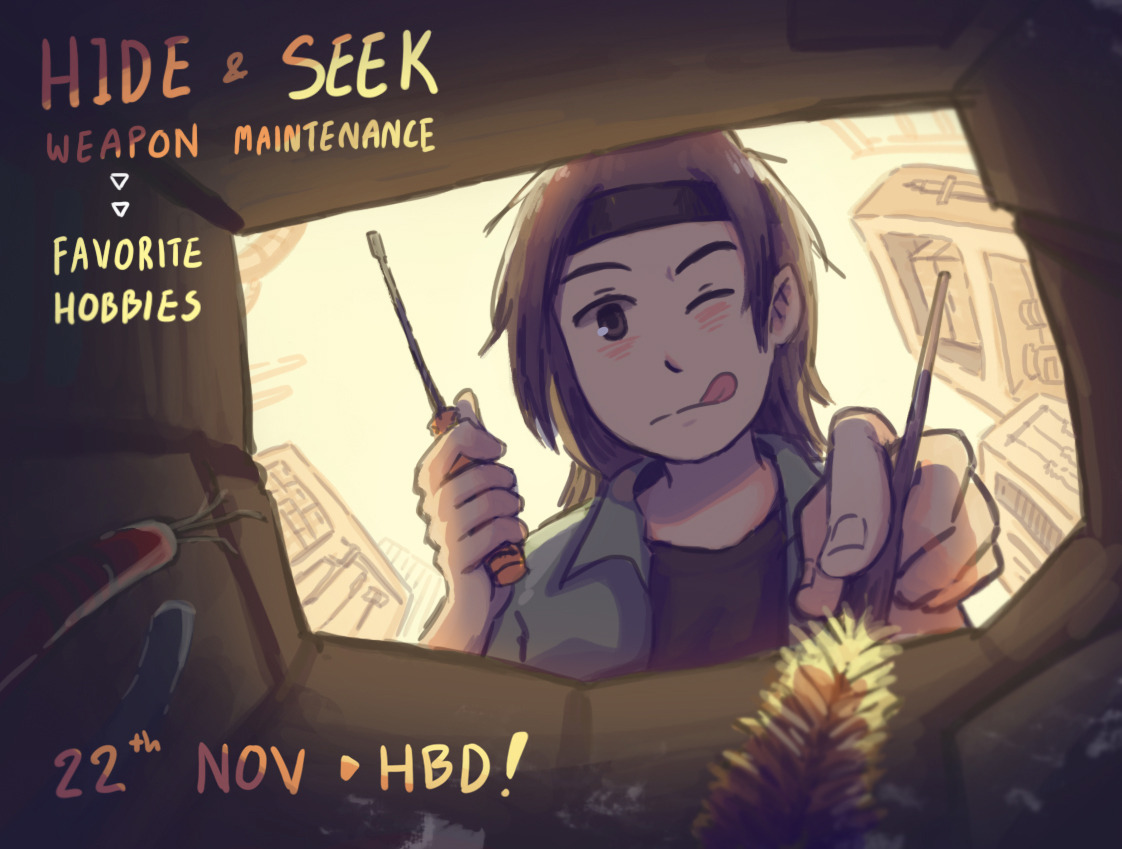 1other :q androgynous birthday black_headband black_shirt blush_stickers box_pov brown_eyes brown_hair closed_mouth collared_jacket commentary dated english_commentary english_text fingernails frown green_jacket green_sleeves happy_birthday headband holding holding_screwdriver indoors jacket kurohebi len'en machinery medium_hair one_eye_closed open_clothes open_jacket other_focus screwdriver shirt short_sleeves solo tongue tongue_out upper_body yamanoskk