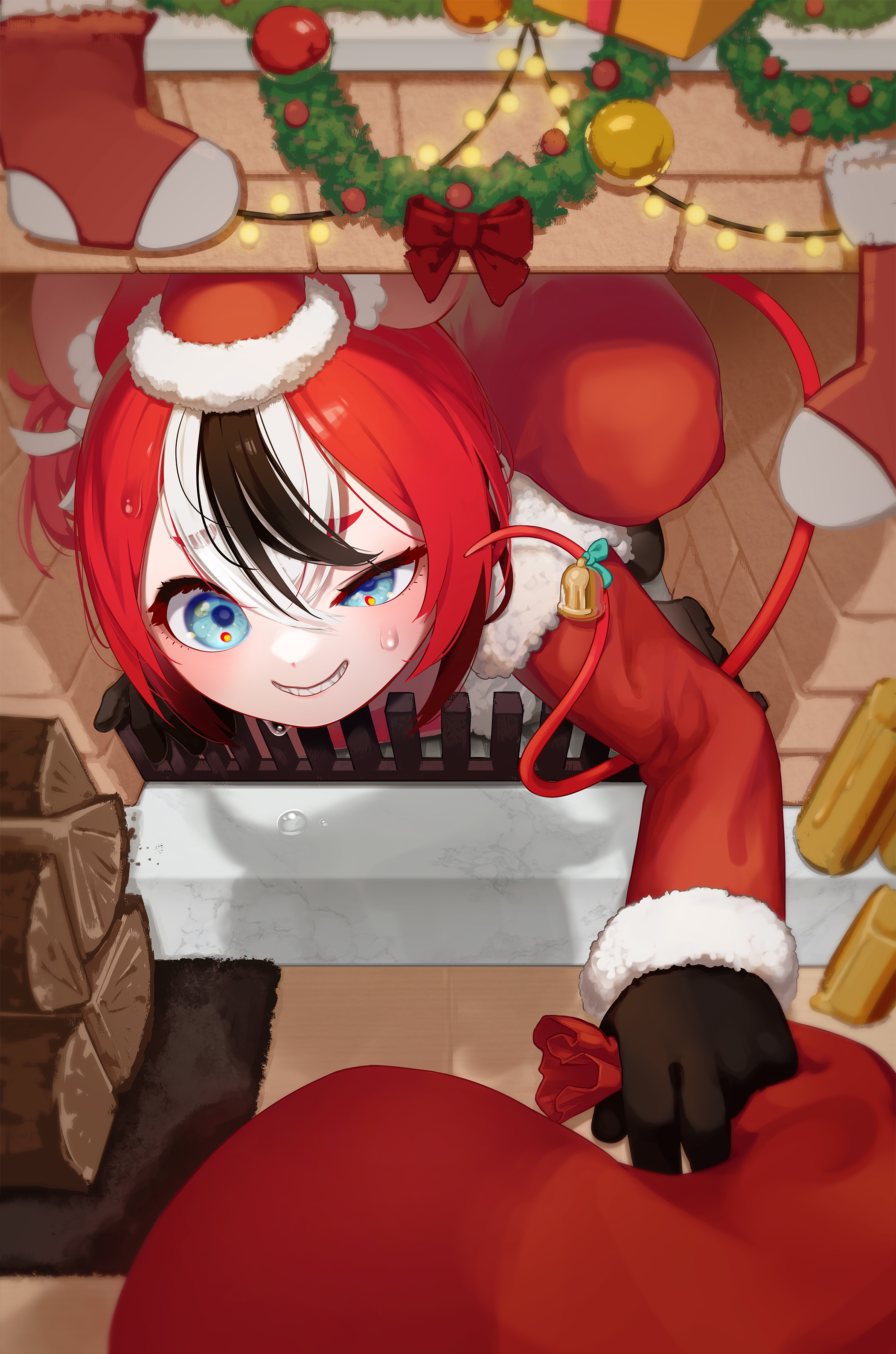 1girl absurdres animal_ears appleblossomtea black_flower black_hair blue_eyes chimney christmas_stocking flower fur-trimmed_jacket fur_trim hakos_baelz hat highres holding holding_sack hololive hololive_english jacket long_hair looking_at_viewer mouse_ears mouse_girl mouse_tail multicolored_hair red_hair red_jacket sack santa_costume santa_hat streaked_hair tail tail_ornament virtual_youtuber white_hair wood