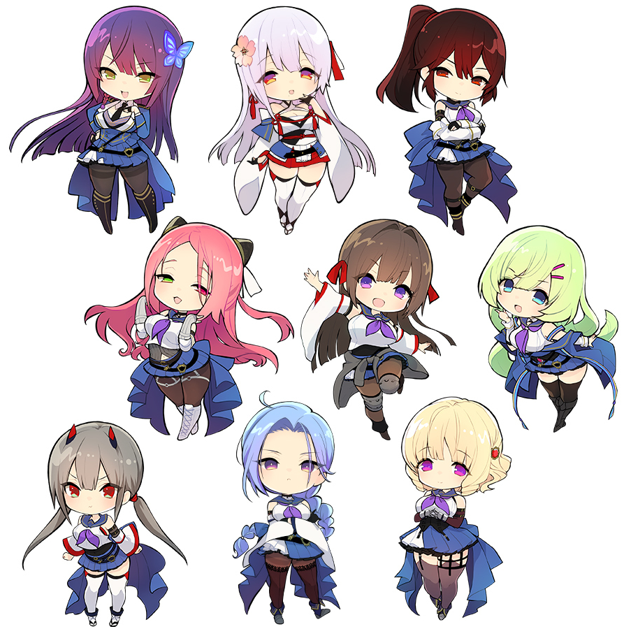6+girls :d ahoge ankle_boots arm_at_side arm_up armored_boots arms_at_sides arms_under_breasts assault_lily bare_shoulders belt black_belt black_footwear black_gloves black_thighhighs blonde_hair blue_eyes blue_hair blue_jacket blue_sailor_collar blue_skirt blunt_bangs blunt_ends boots braid braided_ponytail breasts bright_pupils brown_hair brown_pantyhose butterfly_hair_ornament chibi cleavage closed_mouth clothes_around_waist collared_shirt commentary_request criss-cross_halter crossed_arms detached_sleeves epaulettes floating_hair flower flower_knot fujita_asagao funada_kiito funada_ui garter_straps gauntlets gem gem_hair_ornament gloves green_eyes green_hair grey_footwear grey_hair grey_shirt hair_flower hair_intakes hair_ornament hair_ribbon hairclip hairpods halterneck hand_on_own_chest hand_on_own_hip hand_to_own_mouth hand_up hands_up heel_up heterochromia high_ponytail horns hotaru_(ultraroly_poly) igusa_subaru imamura_yukari_(assault_lily) jacket japanese_clothes kawabata_hotaru kimono kimono_skirt knee_boots knee_pads kozue_west lace-up_boots layered_sleeves leaning_forward leg_belt leg_up light_blush long_hair long_sleeves looking_at_viewer low_poly low_twintails mechanical_horns medium_breasts medium_hair midriff_peek miniskirt mole mole_under_mouth multiple_girls nagasawa_yuki_(assault_lily) neckerchief o-ring o-ring_thigh_strap obi obijime odaiba_girls_high_school_uniform off_shoulder official_art open_mouth outstretched_arms own_hands_together pantyhose parted_bangs parted_lips partially_fingerless_gloves pink_flower pleated_skirt ponytail purple_eyes purple_hair purple_neckerchief red_eyes red_gem red_hair red_horns red_ribbon ribbon sailor_collar sandals sash school_uniform serafuku shiba_tomoshibi shirt short_hair short_kimono siblings side_braid simple_background single_braid sisters skirt sleeveless sleeveless_shirt sleeves_past_wrists smile standing standing_on_one_leg tassel tassel_hair_ornament thigh_strap thighband_pantyhose thighhighs thighhighs_over_pantyhose thighhighs_under_boots twintails undershirt v-shaped_eyebrows very_long_hair waist_cape white_background white_footwear white_kimono white_pupils white_ribbon white_shirt white_thighhighs wide_sleeves zettai_ryouiki zouri