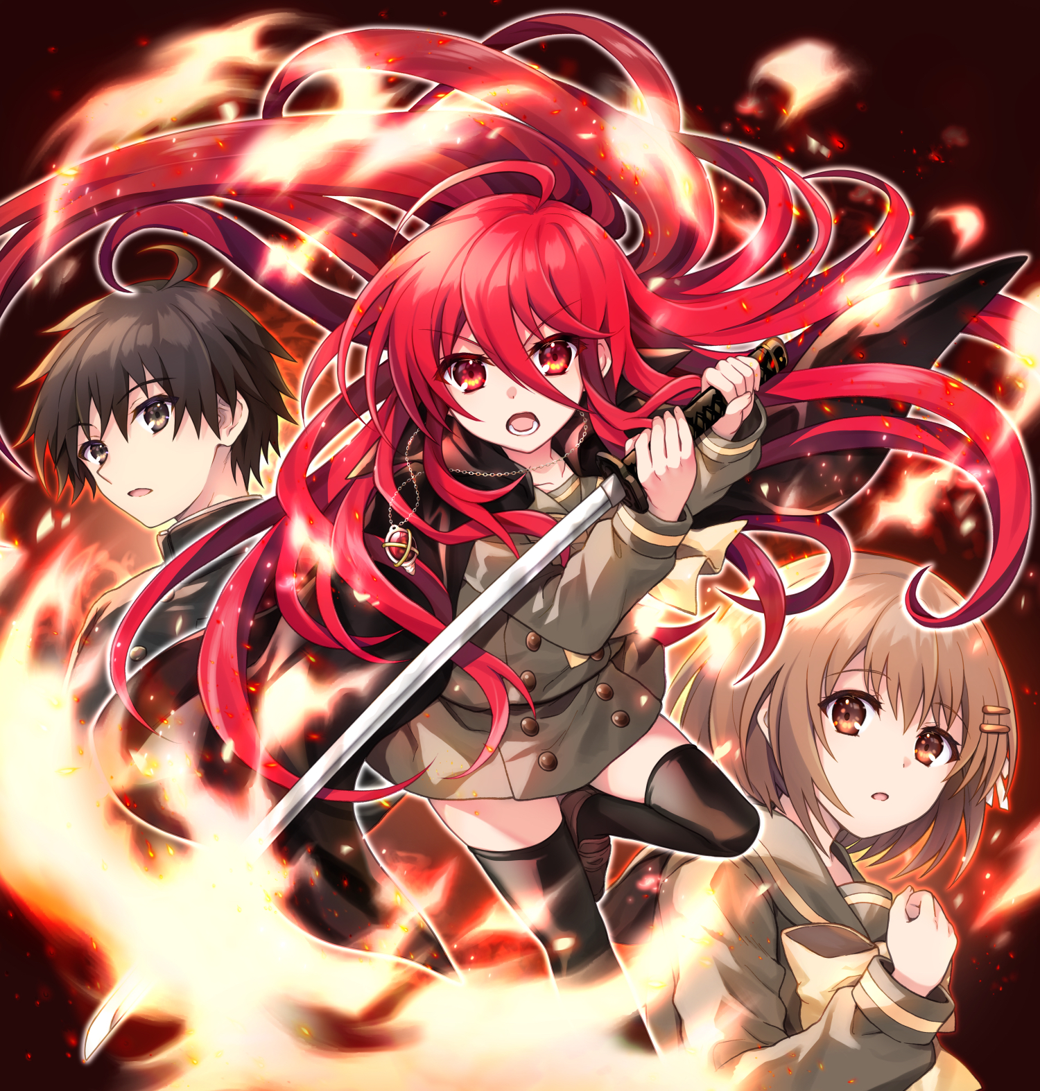 1boy 2girls alastor_(shakugan_no_shana) black_thighhighs brown_eyes brown_footwear brown_hair brown_sailor_collar brown_skirt brown_vest hair_between_eyes hair_ornament hairclip highres loafers long_hair long_sleeves looking_at_viewer medium_hair miniskirt misaki_high_school_uniform multiple_girls neckerchief open_mouth red_eyes red_hair sailor_collar sakai_yuuji school_uniform shakugan_no_shana shana shoes short_hair skirt straight_hair tachitsu_teto thighhighs very_long_hair vest weapon yellow_neckerchief yoshida_kazumi zettai_ryouiki