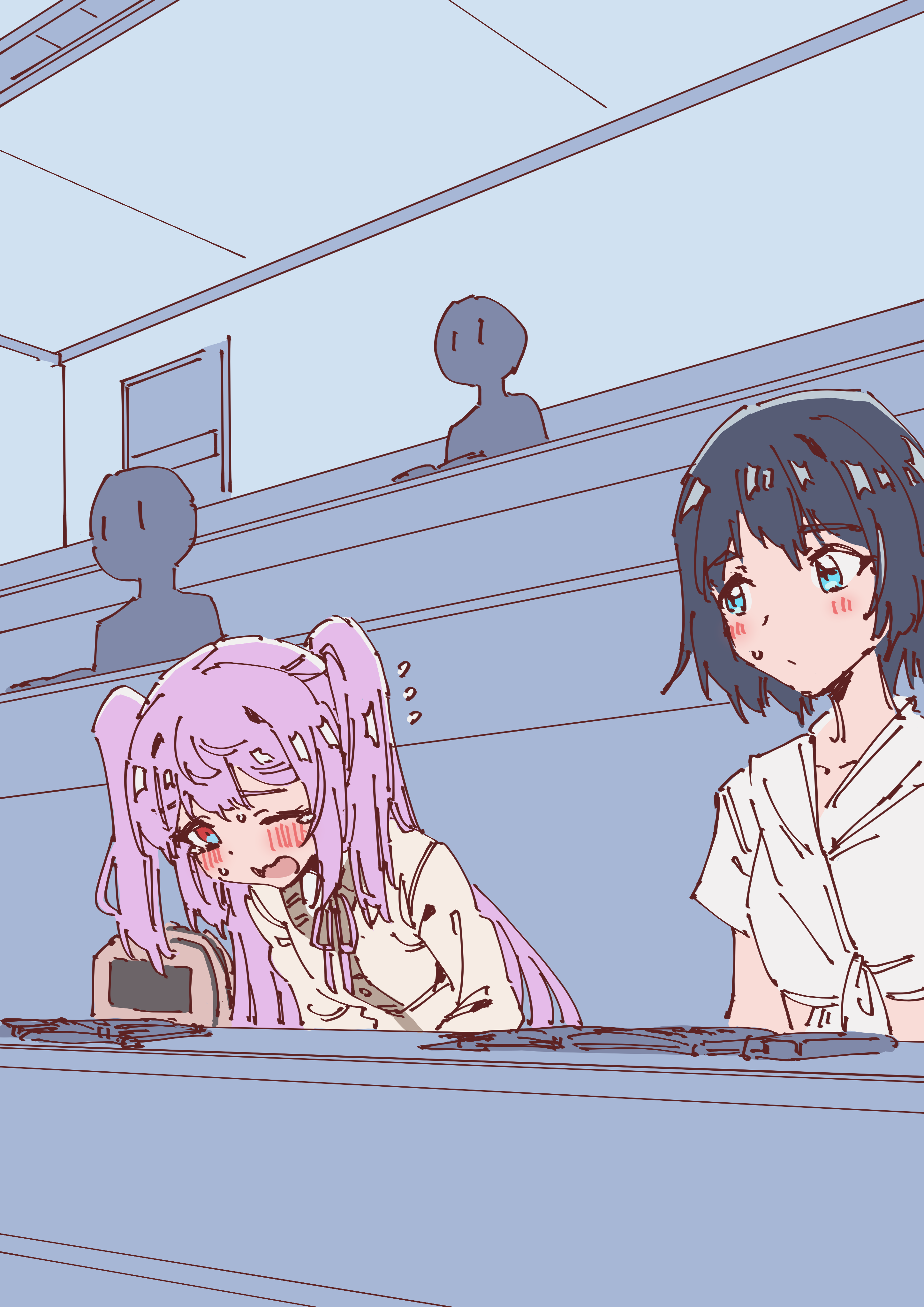 absurdres backpack bag blue_eyes blue_hair blush bob_cut book cardigan classroom crop_top dark_blue_hair flying_sweatdrops highres long_hair midriff_peek neck_ribbon one_eye_closed open_book original pink_hair red_eyes ribbon rita_(rune_(dualhart)) rune_(dualhart) school_uniform short_hair thalia_(rune_(dualhart)) two_side_up