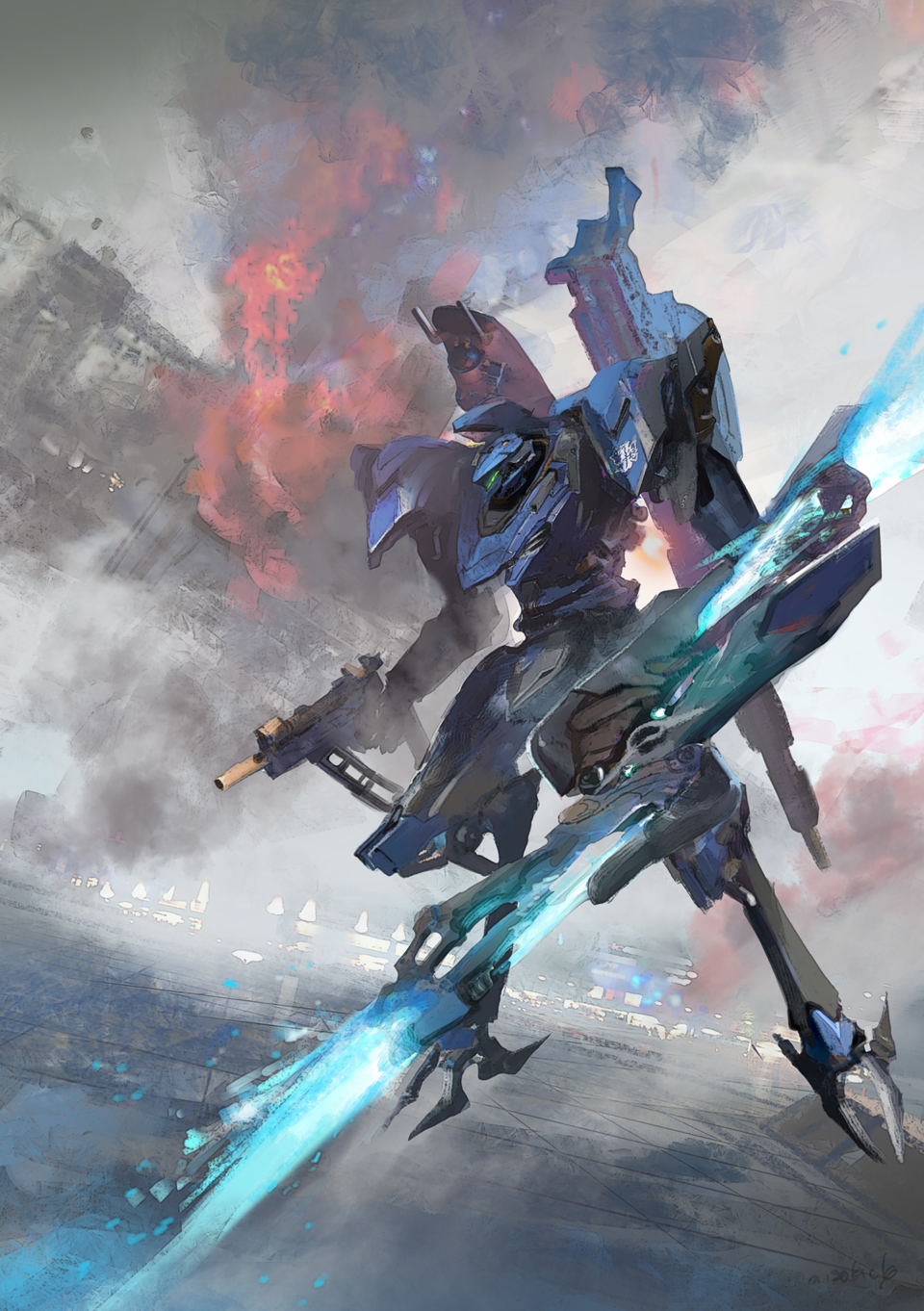 armored_core armored_core_vi:_fires_of_rubicon double_blade energy_blade full_body green_eyes gun handgun highres holding holding_gun holding_weapon mecha mecha_focus midair miso_katsu missile_pod no_humans outdoors reverse-jointed_legs robot science_fiction smoke steel_haze thrusters weapon