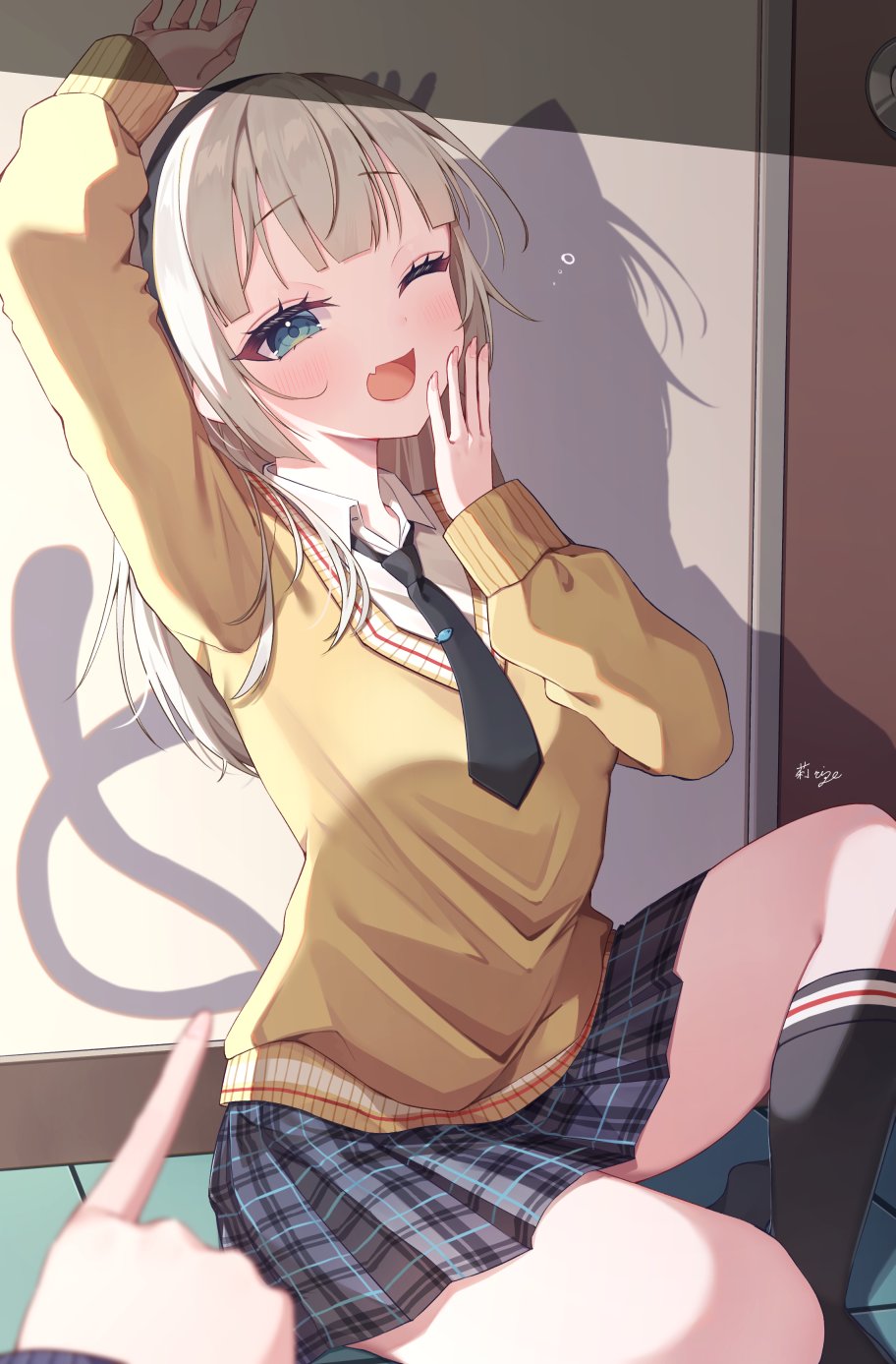 1girl black_headband black_necktie black_skirt black_socks blonde_hair blue_eyes collared_shirt different_shadow headband highres itoi_toi long_hair necktie one_eye_closed original plaid_clothes plaid_skirt pleated_skirt pointing shirt skirt socks solo white_shirt