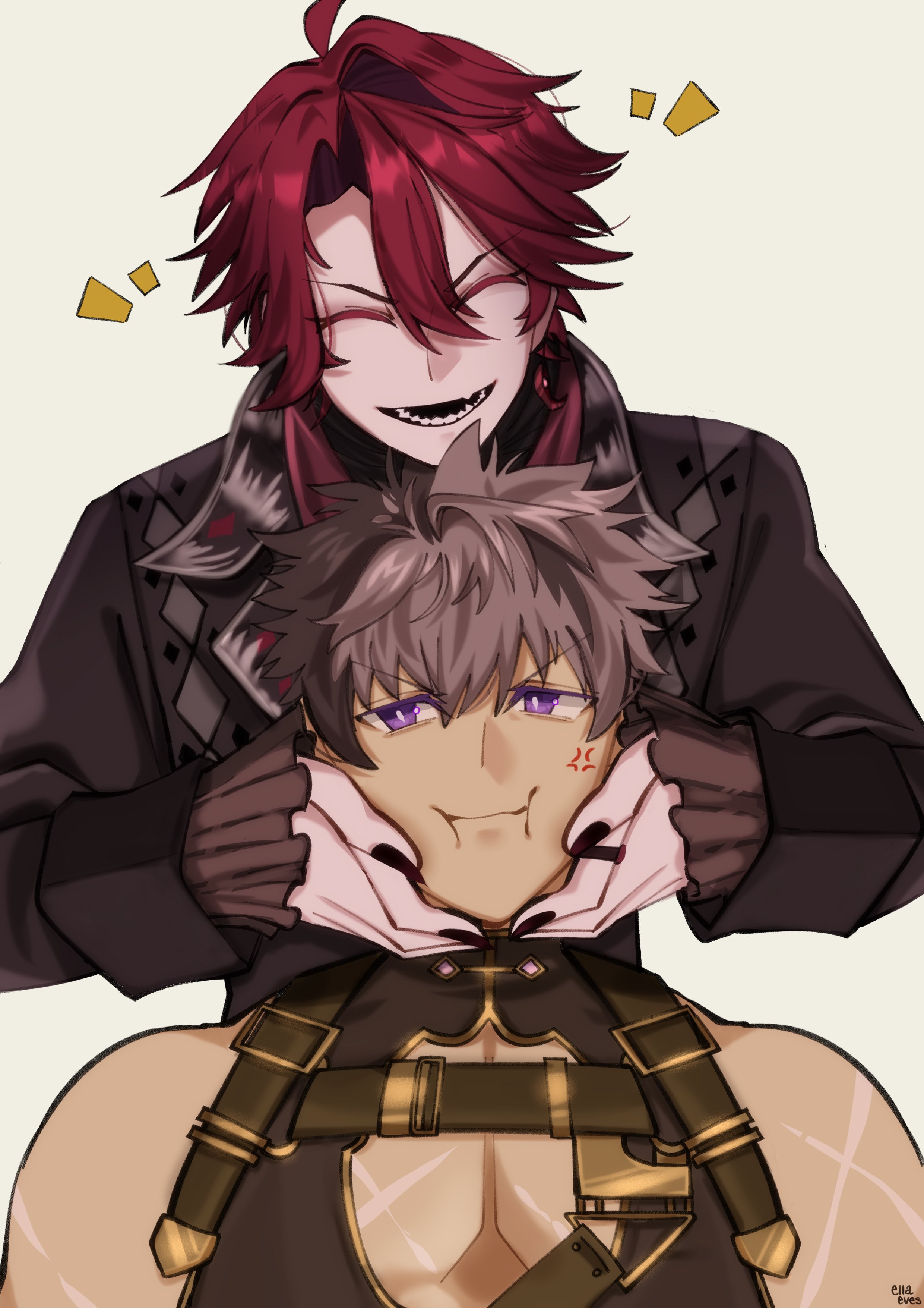 2boys absurdres ahoge anger_vein black_hair black_nails cleavage_cutout closed_eyes clothing_cutout commentary crimzon_ruze ella_eves english_commentary facing_viewer grey_hair hair_between_eyes hands_on_another's_cheeks hands_on_another's_face highres holostars holostars_english jewelry jurard_t_rexford large_pectorals laughing looking_to_the_side male_focus multicolored_hair multiple_boys muscular muscular_male open_mouth pectorals purple_eyes red_hair ring sharp_teeth short_hair smile squishing teeth two-tone_hair upper_body v-shaped_eyebrows virtual_youtuber white_background