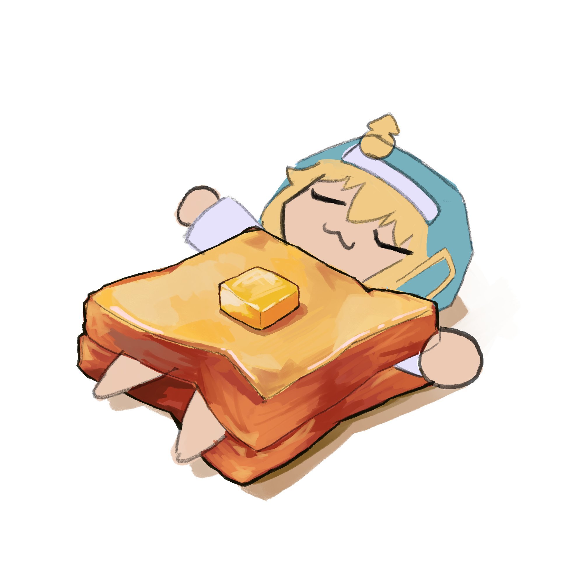 1boy :3 blonde_hair blue_headwear bread bridget_(guilty_gear) butter chibi chibi_only closed_eyes commentary english_commentary food guilty_gear habit highres in_food outstretched_arms sandwich shadow simple_background siquesis spread_arms t-pose uwu white_background