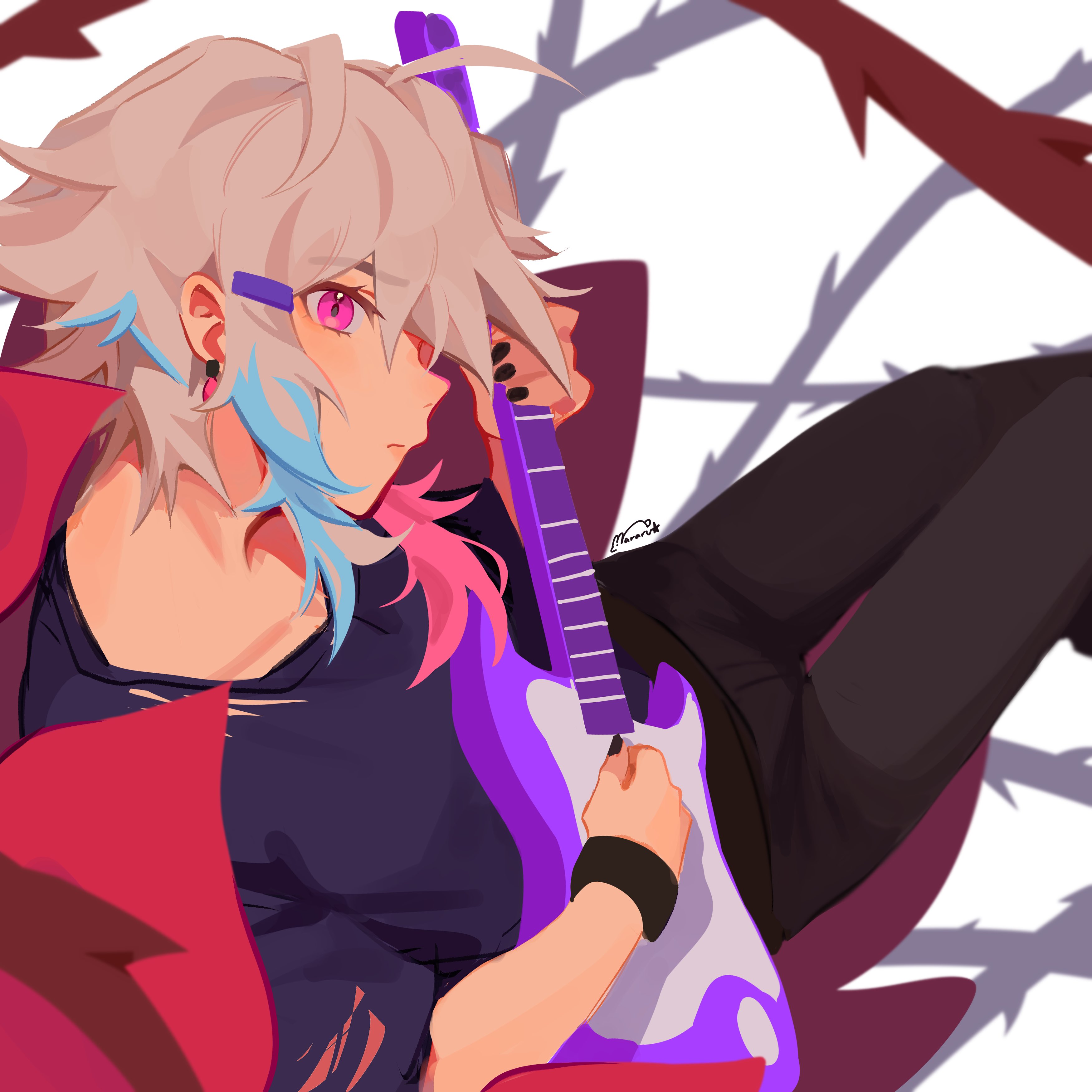 1boy absurdres ahoge androgynous black_nails black_pants blue_hair blue_shirt commentary earrings english_commentary from_side gavis_bettel grey_hair guitar hair_between_eyes highres holding holding_guitar holding_instrument holostars holostars_english instrument jewelry looking_at_viewer male_focus mararu multicolored_hair pants pink_eyes pink_hair profile shirt signature skinny_jeans solo thigh_gap trap virtual_youtuber