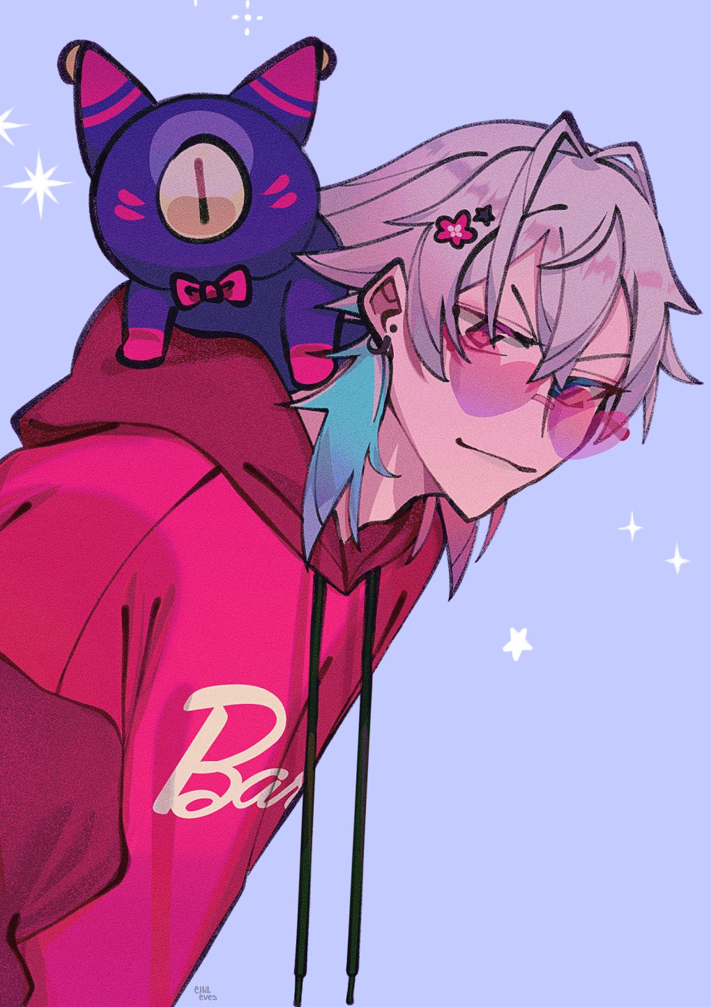 1boy blue_background blue_eyes blue_hair commentary creature earrings ella_eves english_commentary flower gavis_bettel gradient_background grey_hair hair_between_eyes hair_flower hair_ornament hairpin heart heart-shaped_eyewear heterochromia highres holostars holostars_english hood hood_basket hoodie jewelry leaning_forward male_focus multicolored_hair multiple_hairpins phantom_(gavis_bettel) pink_eyes pink_hair pink_hoodie short_hair smile solo sparkle upper_body virtual_youtuber
