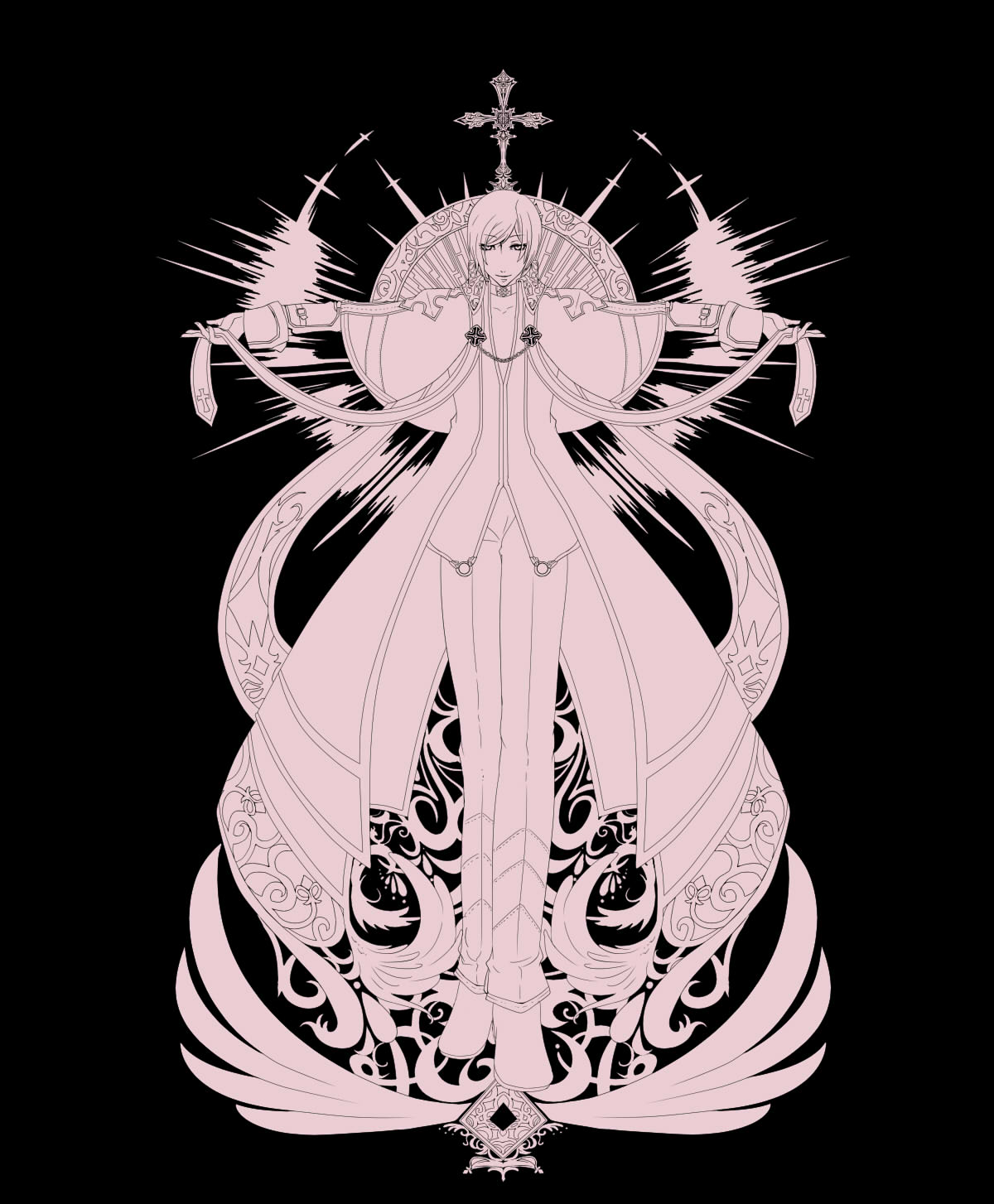 1boy arch_bishop_(ragnarok_online) capelet choker closed_mouth coat commentary_request cross flowery_peko full_body highres looking_at_viewer male_focus monochrome official_alternate_costume pants pink_theme ragnarok_online shirt shoes short_hair smile solo standing swept_bangs t-pose