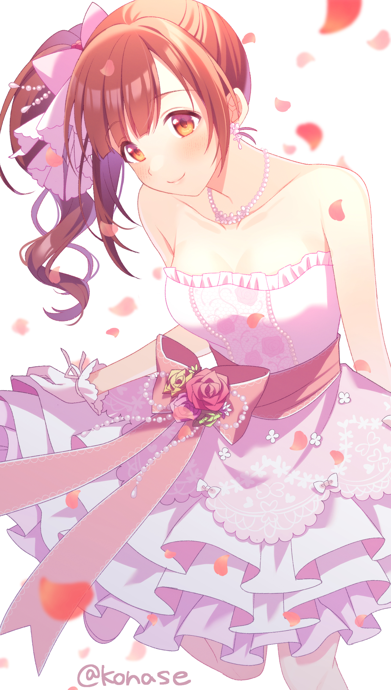 1girl bare_shoulders blurry blush bow breasts brown_eyes brown_hair closed_mouth collarbone depth_of_field dress dress_bow falling_petals flower frilled_dress frills gloves hair_bow hair_ribbon highres holding_own_dress idolmaster idolmaster_cinderella_girls idolmaster_cinderella_girls_starlight_stage igarashi_kyoko konase_(non_stop!) layered_dress long_hair looking_at_another medium_breasts petals pink_bow pink_dress pink_flower pink_ribbon ribbon side_ponytail smile solo standing standing_on_one_leg strapless strapless_dress twitter_username white_background white_gloves yellow_flower