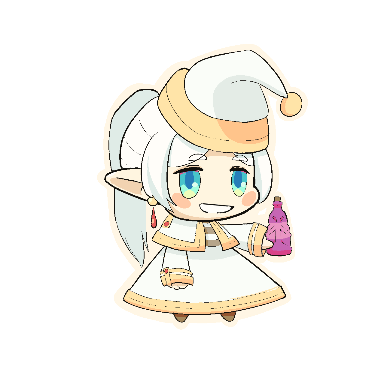 1girl arm_at_side blue_eyes blush_stickers bottle buttoned_cuffs buttons chibi chibi_only cloak cork corked_bottle dress earrings elf feet female_focus frieren full_body gold_trim grin hat highres holding holding_bottle holding_potion jewelry jitome long_hair long_sleeves looking_at_viewer meme non-web_source outstretched_arm padoru_(meme) parody parted_bangs pointy_ears ponytail potion robe santa_costume santa_dress santa_hat simple_background smile solo sousou_no_frieren standing straight_hair striped_clothes white_background white_hair white_robe you_can_just_give_this_kind_of_thing_to_men_and_they_will_be_thrilled_(meme)