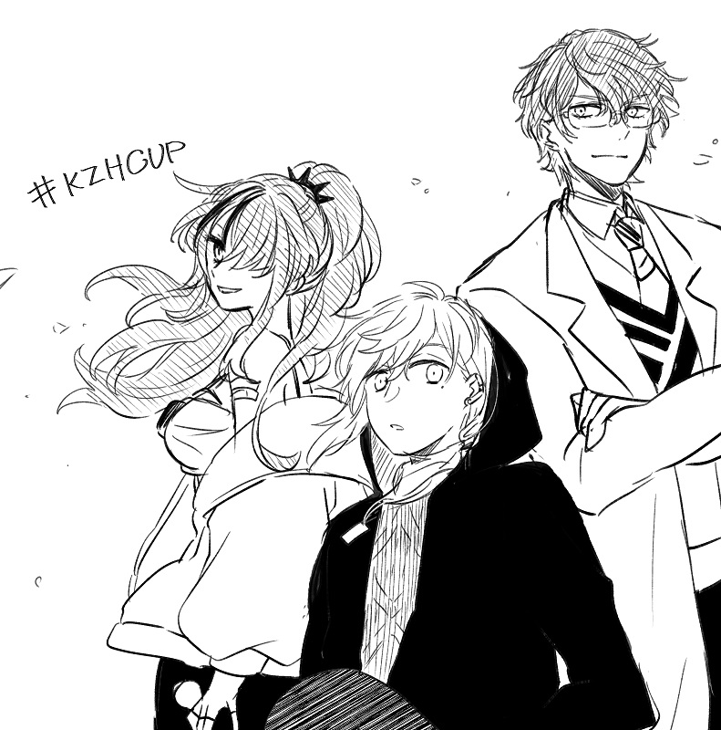 1girl 2boys bare_shoulders breasts closed_mouth collared_shirt crossed_arms ear_piercing fingerless_gloves gloves greyscale hair_between_eyes hair_over_one_eye hood hood_up hooded_jacket jacket kanae_(8th_costume)_(nijisanji) kanae_(nijisanji) lab_coat lain_paterson lain_paterson_(1st_costume) leos_vincent leos_vincent_(1st_costume) long_sleeves maru_(memoriatechnica) medium_breasts mole mole_under_eye monochrome multicolored_hair multiple_boys necktie nijisanji off_shoulder open_clothes open_jacket parted_lips piercing puffy_long_sleeves puffy_sleeves shirt simple_background smile streaked_hair v-shaped_eyebrows virtual_youtuber white_background