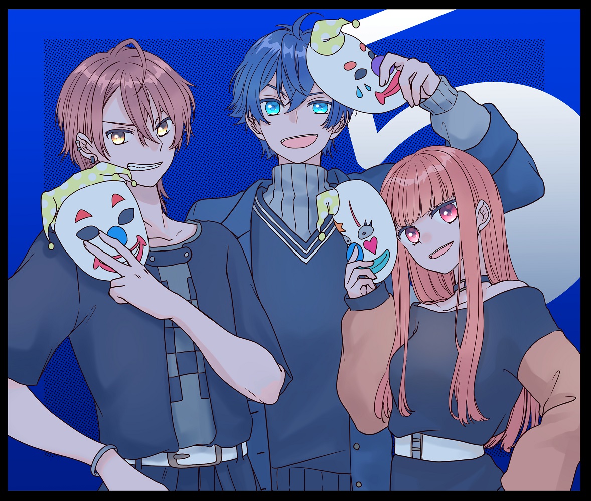 1girl 2boys :d black_border black_jacket black_pants black_shirt blue_background blue_eyes blue_hair blue_jacket border brown_eyes brown_hair character_request clown_mask collarbone colorful_peach grey_shirt grey_sweater grin holding holding_mask jacket long_sleeves maru_(memoriatechnica) mask multiple_boys open_clothes open_jacket open_mouth pants puffy_long_sleeves puffy_sleeves red_eyes ribbed_sweater shirt short_sleeves sleeves_past_wrists smile sweater sweater_vest turtleneck turtleneck_sweater unworn_mask v-shaped_eyebrows