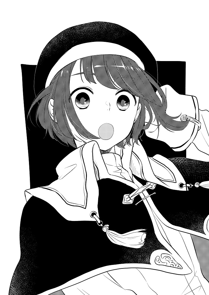 1girl :o arm_behind_head arm_up beret black_background capelet greyscale hat long_sleeves looking_at_viewer maru_(memoriatechnica) monochrome open_mouth original shirt solo two-tone_background upper_body white_background
