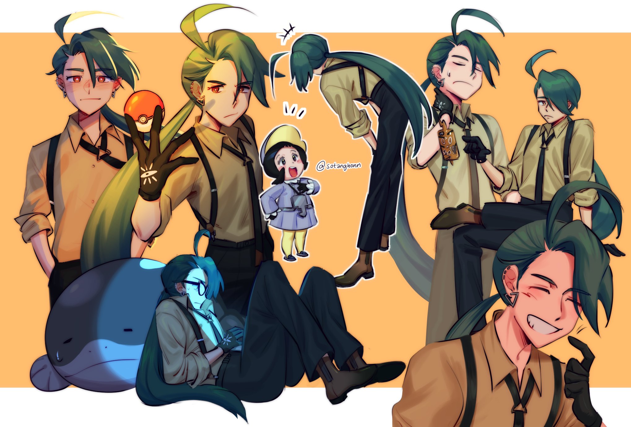 2girls bent_over black_gloves black_hair blush clodsire closed_eyes commentary crossed_legs earrings flat_chest gen_4_pokemon glasses gloves green_hair grin hair_over_one_eye hand_on_own_neck highres holding holding_poke_ball invisible_chair jewelry long_hair low_ponytail multiple_girls necktie nintendo opaque_glasses poke_ball poke_ball_(basic) pokemon pokemon_(creature) pokemon_scarlet_and_violet ponytail poppy_(pokemon) red_eyes reverse_trap rika_(pokemon) rotom rotom_phone short_hair sitting smile sotanghonn suspenders sweatdrop very_long_hair