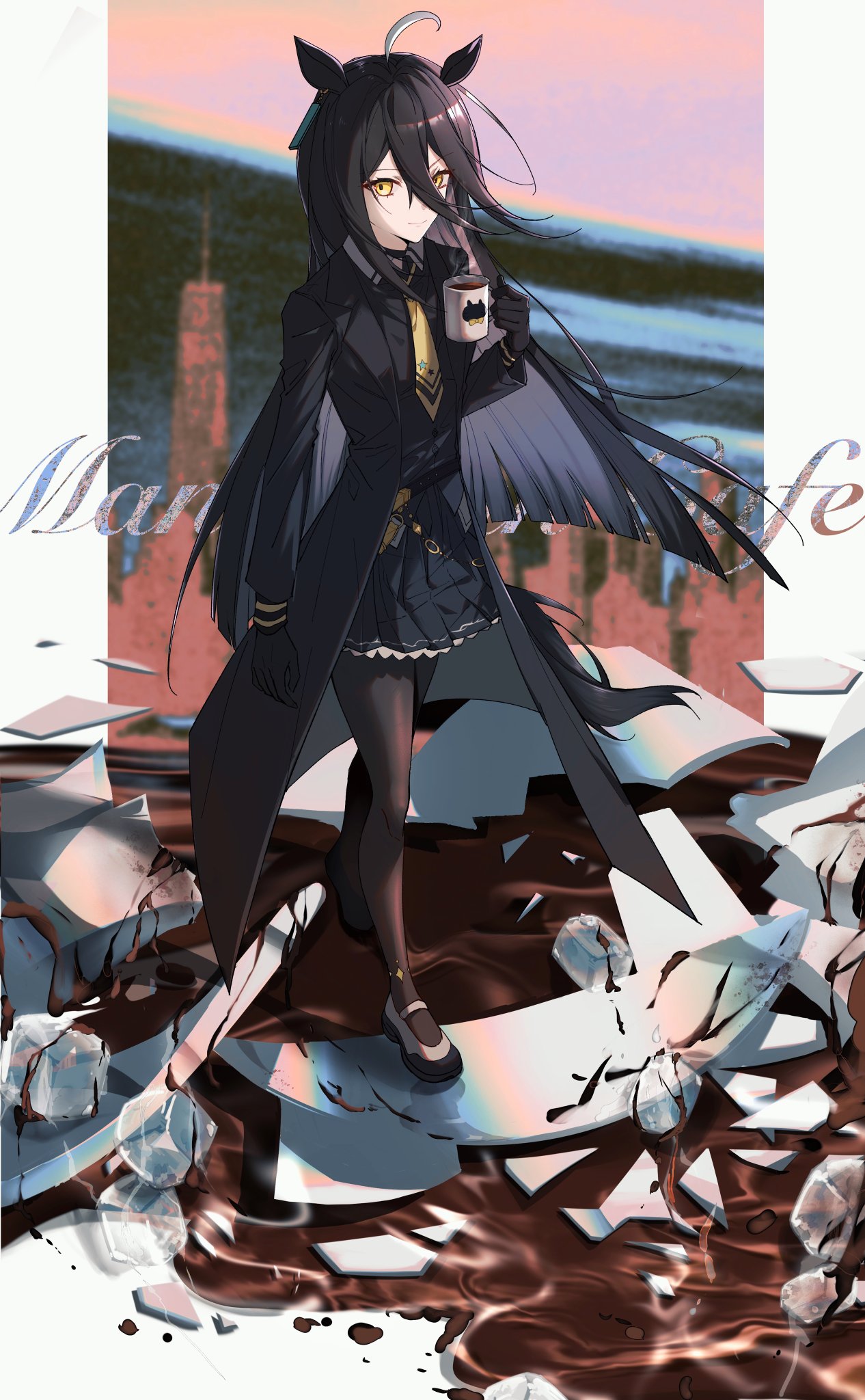 1girl ahoge animal_ears arm_at_side belt black_coat black_gloves black_hair black_pantyhose black_shirt broken_cup character_name choker closed_mouth coat coffee collared_shirt cup earrings gloves hair_between_eyes hand_up highres holding holding_cup horse_ears horse_girl horse_tail ice ice_cube jewelry long_hair long_sleeves manhattan_cafe_(umamusume) mary_janes multicolored_hair necktie ninaki999 open_clothes open_coat oversized_object pantyhose shirt shoes single_earring smile solo steam streaked_hair tail umamusume walking yellow_eyes yellow_necktie